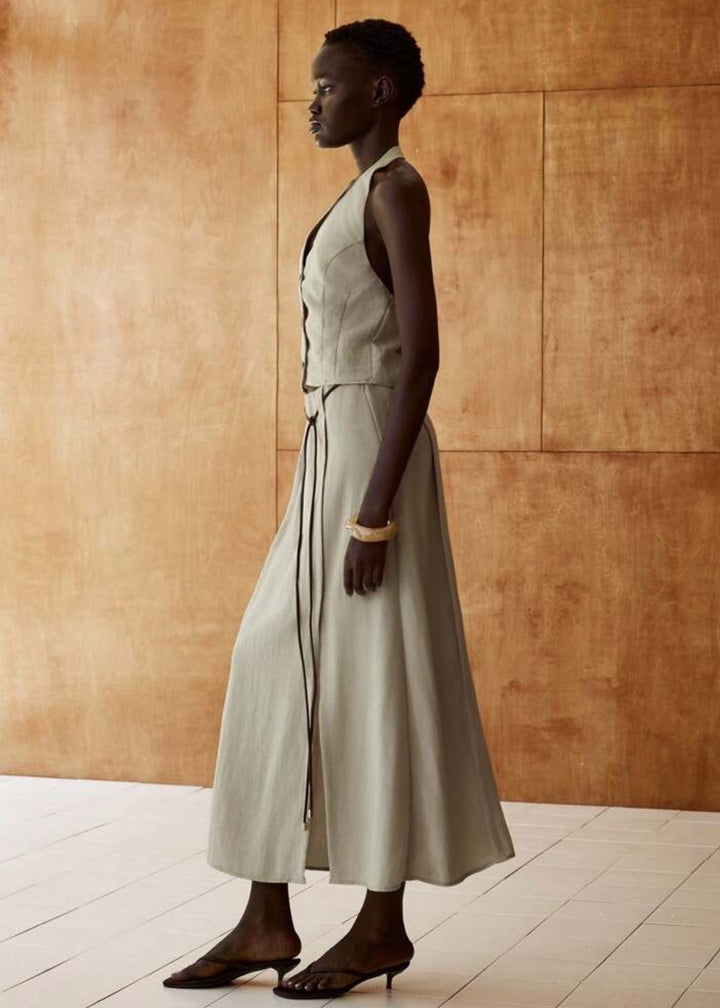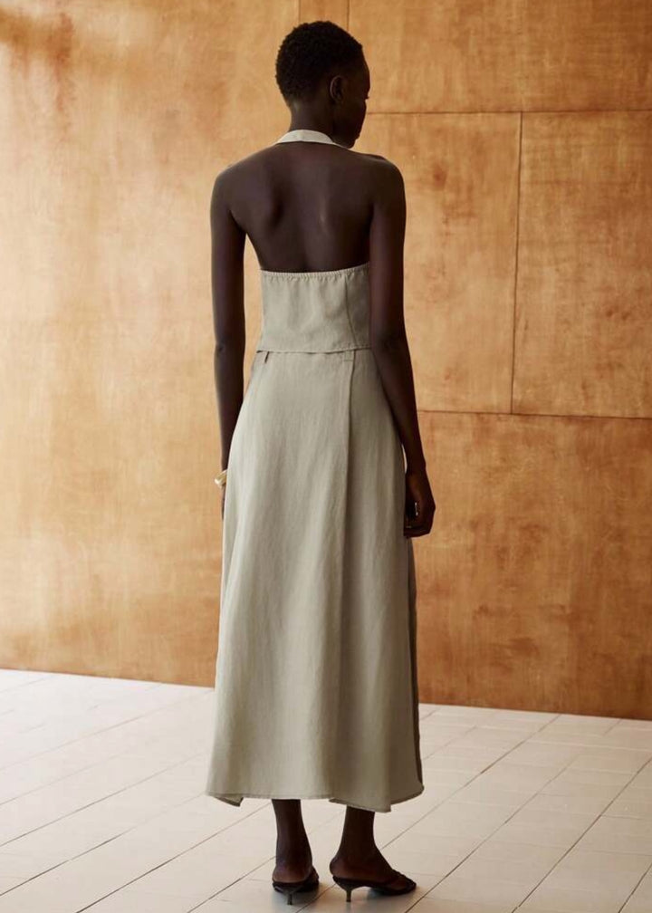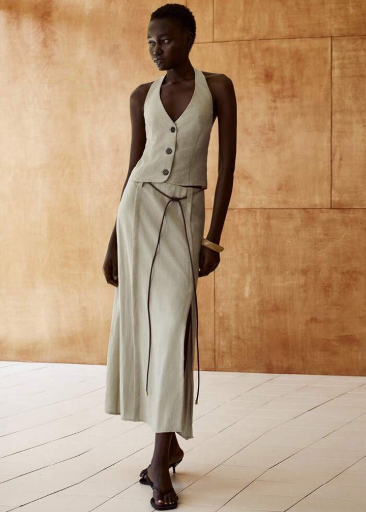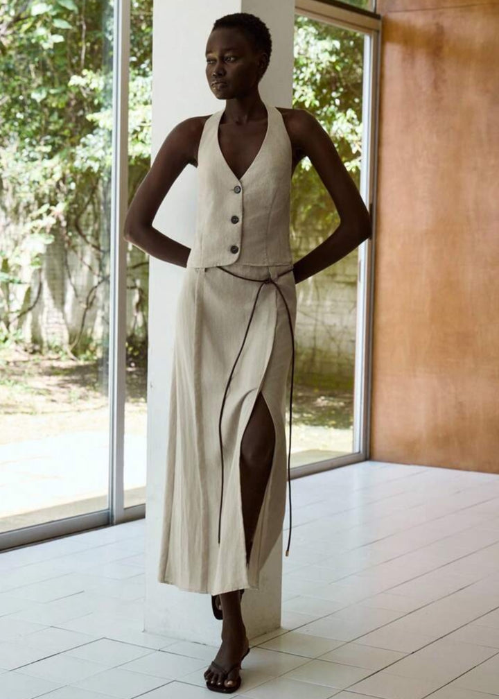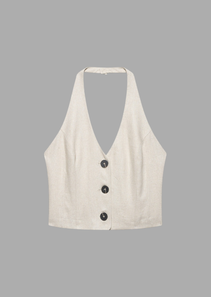 This vest top features a sophisticated halter neckline that ties at the back, offering an adjustable and flattering fit. It includes a button-front closure, allowing for versatile styling. The top is designed with a fitted silhouette, tailored to highlight the waist. Crafted from a lightweight and breathable fabric, it is ideal for warmer climates.