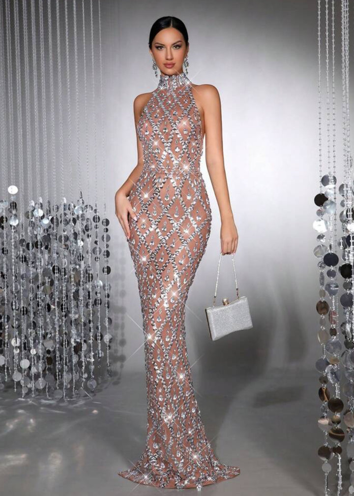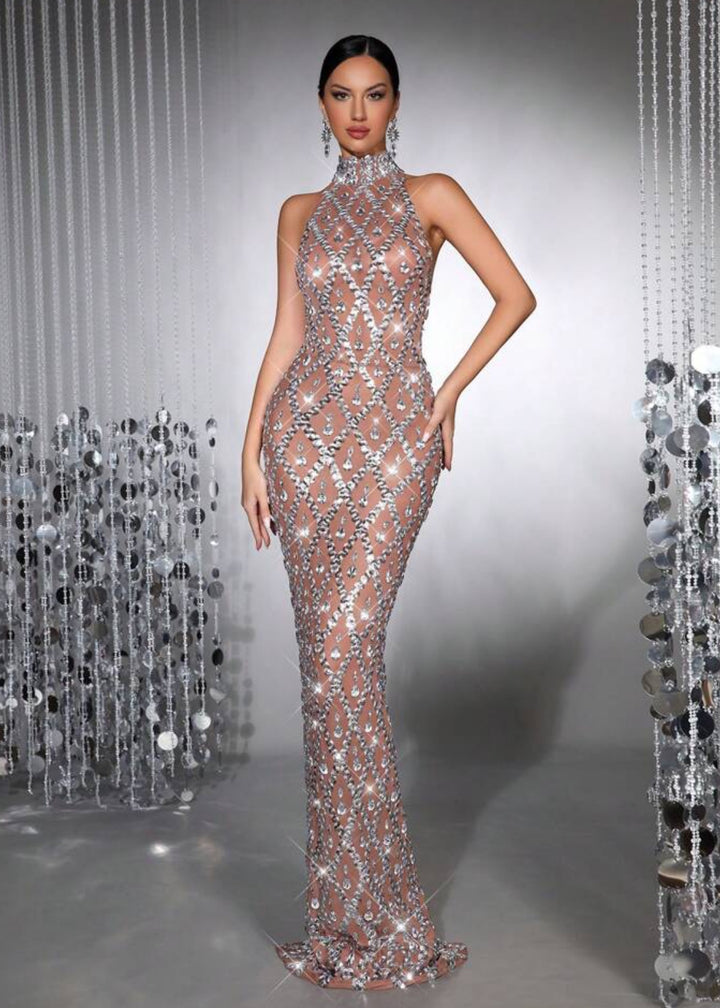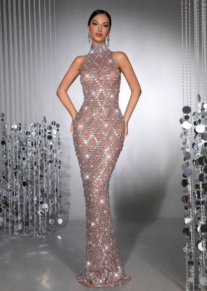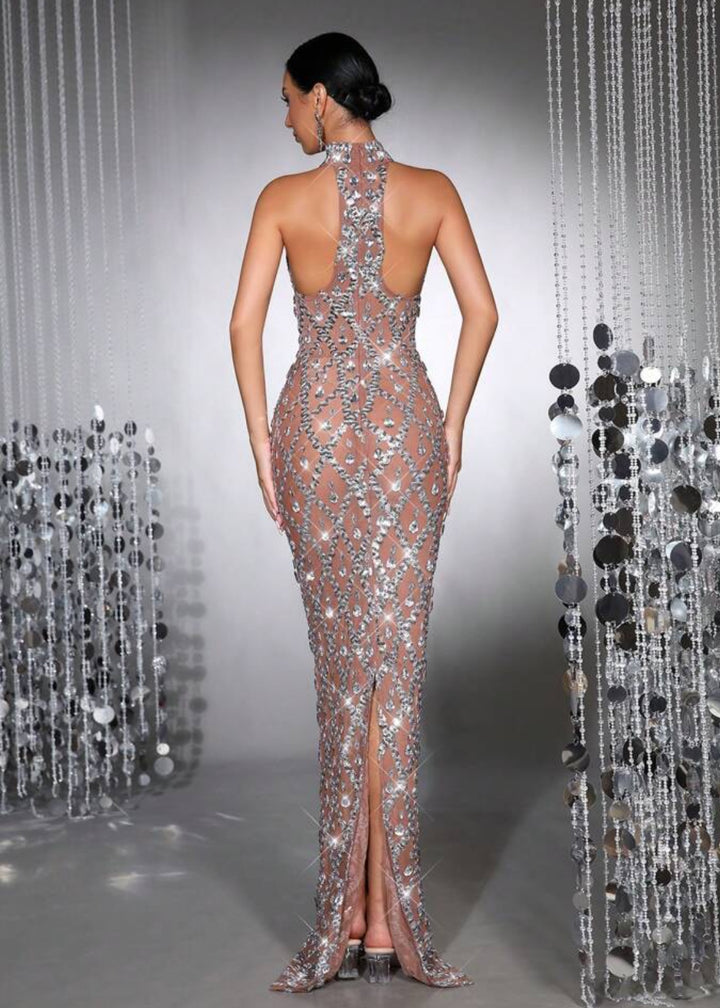 This striking maxi dress features a sophisticated high neckline and a sleeveless design. A sheer overlay fabric is intricately embellished with sparkling stones in a geometric pattern, creating a dazzling effect. The dress has a fitted silhouette and a subtle back slit for ease of movement, perfect for making a grand entrance at formal events.