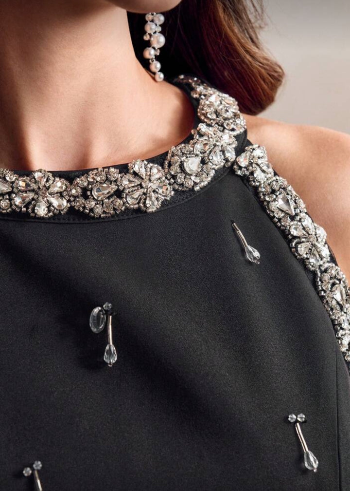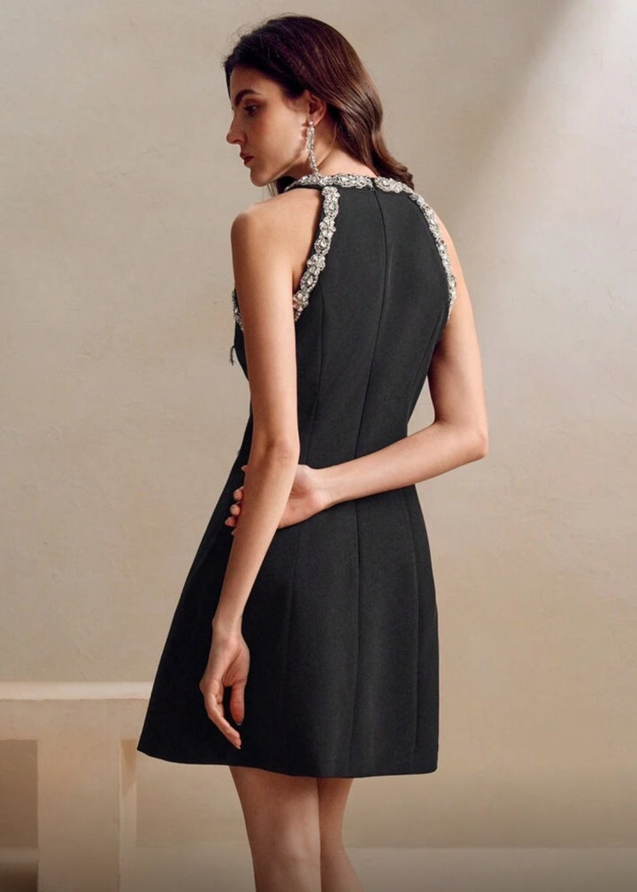 This mini dress features an elegant halterneck design, beautifully adorned with a dense crystal embellishment along the neckline. The dress boasts a playful, scattered pattern of small, delicate music note charms across the A-line skirt. The structured fabric and tailored fit create a sophisticated silhouette, perfect for evening events.