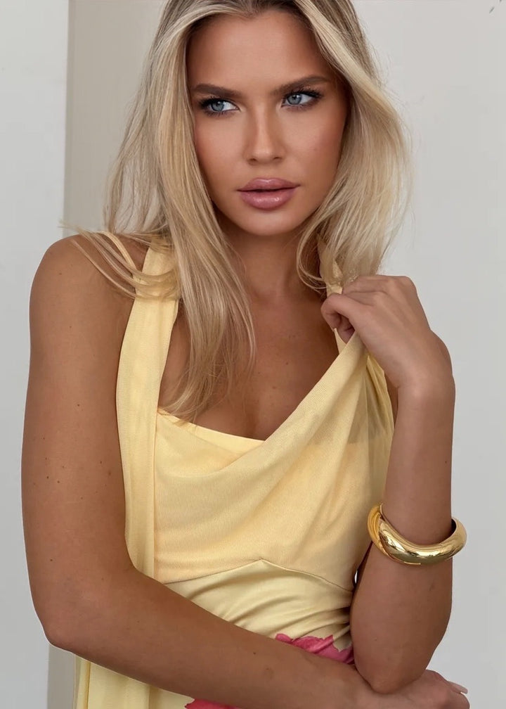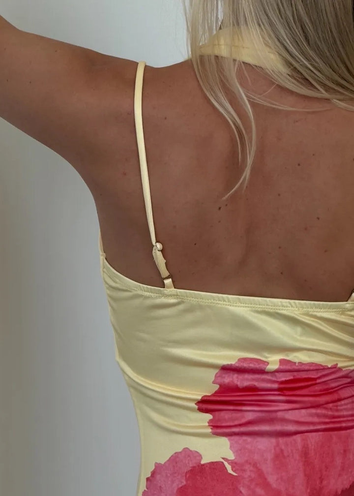 To ensure your dress remains in pristine condition, we recommend hand washing or using the gentle cycle on your machine with cold water. Lay flat or hang to dry to maintain the fabric's integrity and prevent stretching or fading.