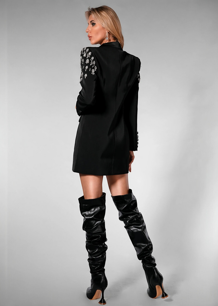 This blazer dress combines the classic silhouette of a double-breasted blazer with the elegance of an evening gown. It features a sophisticated lapel collar, double-breasted buttons, and a structured fit. The statement-making feature is the elaborate rhinestone embellishment on the shoulders, creating a dramatic, cascading effect. The dress also has a satin-finished lapel and is a mini length.