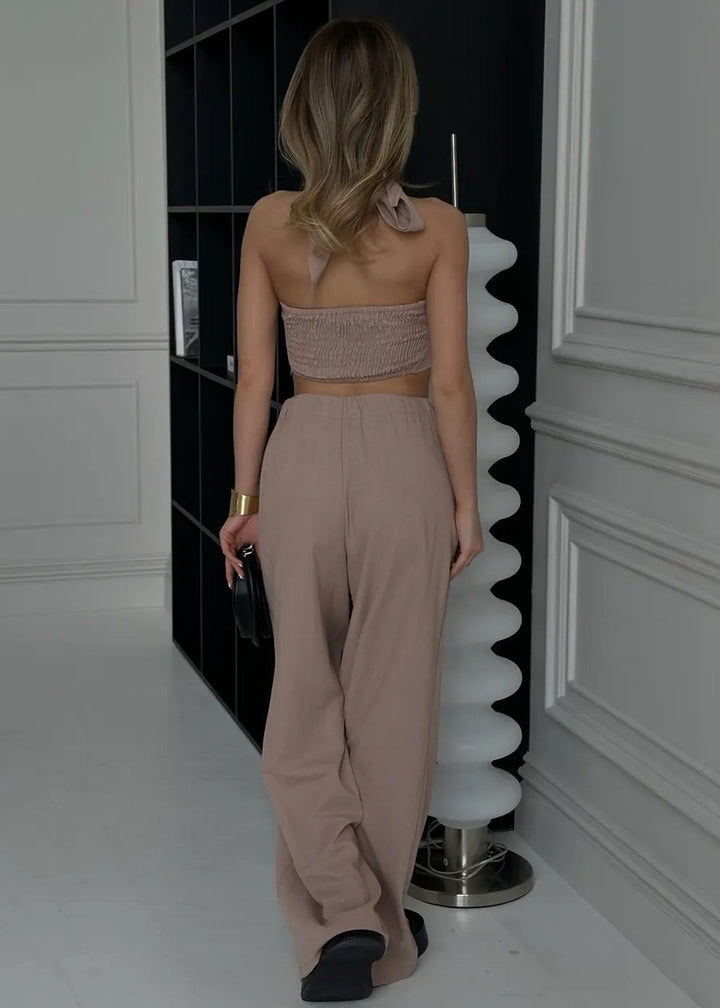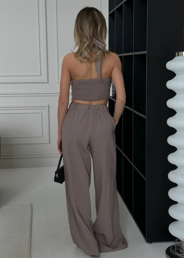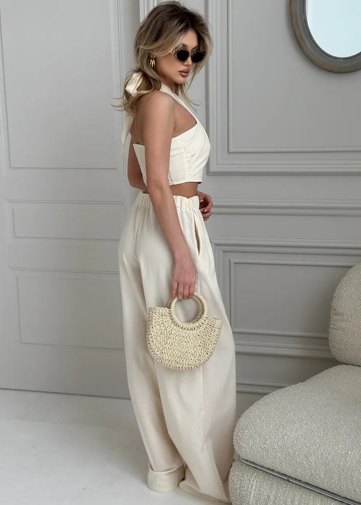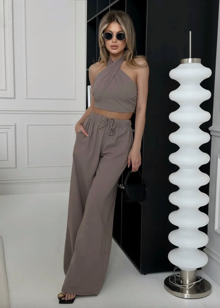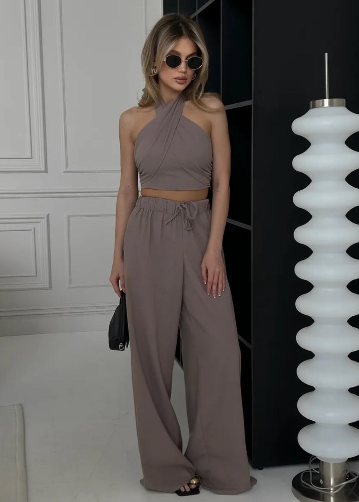 Discover the perfect blend of style and comfort with this wrap crop top and wide leg pants set. This outfit is ideal for both casual outings and chic gatherings, providing a contemporary look that stands out.