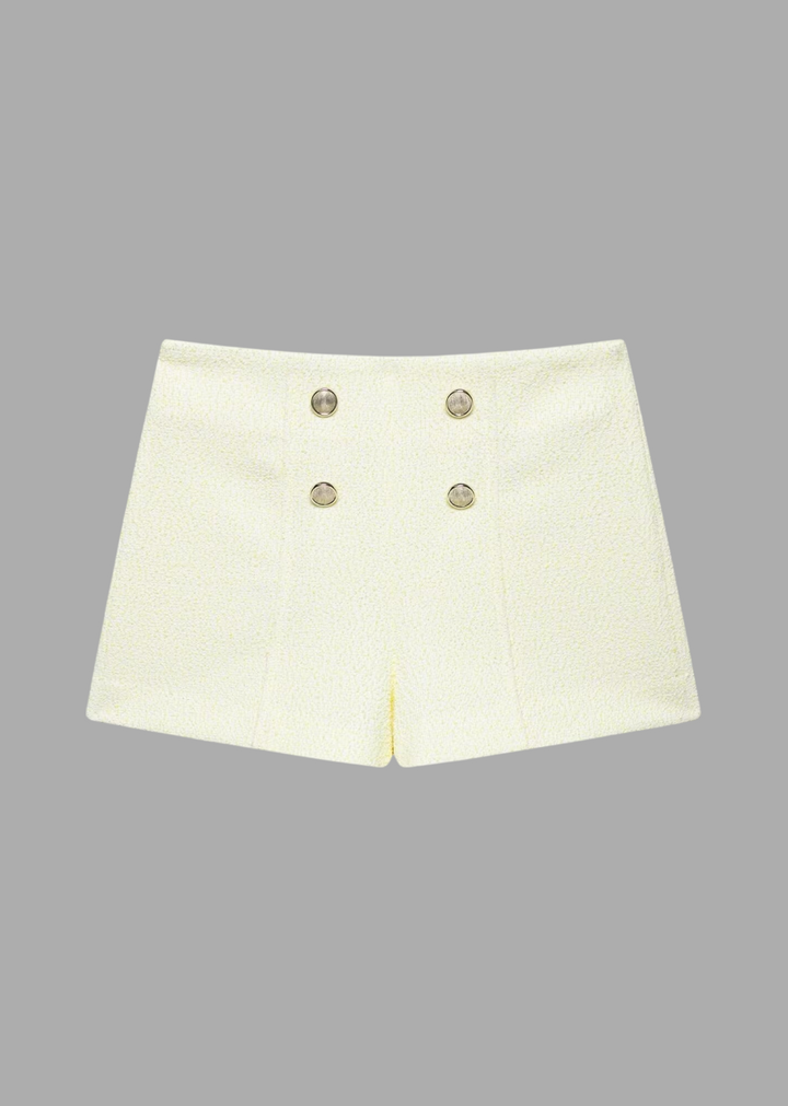 These tailored high waist shorts combine classic elements with modern structure. Crafted from textured tweed fabric, the silhouette features a front panel with double rows of pearl-detailed buttons that mirror the coordinating cropped top. Designed to sit high on the waist, these shorts elongate the legs while maintaining a clean, polished look. Style with the matching tweed top for a refined set, or pair with a minimalist blouse or oversized shirt for a relaxed yet elevated outfit.