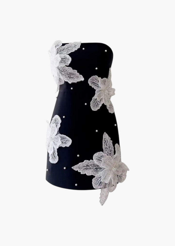This stunning mini dress features a strapless, form-fitting silhouette that is both modern and elegant. The dress is adorned with intricate floral applique details and delicate pearl embellishments, creating a captivating and textured design. The structured fit hugs the body, and the mini length adds a playful touch. A concealed zipper closure at the back ensures a smooth and secure fit. This dress is perfect for cocktail events, parties, or any occasion where you want to make a sophisticated statement.
