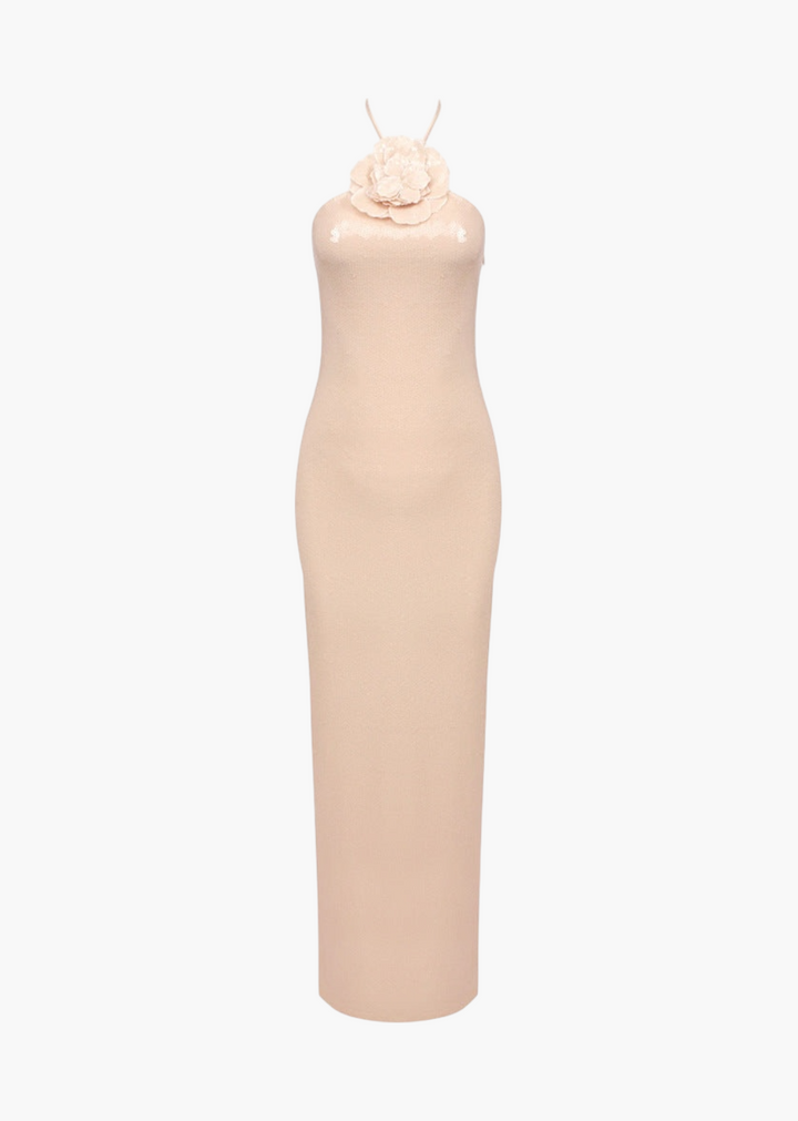 This elegant maxi dress features a unique halter neckline, created by a delicate cord that fastens behind the neck. A large, three-dimensional floral applique at the collarbone serves as a focal point, adding a romantic and sculpted detail. The dress is fully adorned with light-reflecting sequins from top to bottom, providing a subtle sparkle. The silhouette is a sleek, form-fitting maxi, with a high slit on one side for ease of movement and a touch of allure. A zipper closure is located at the back for a smooth, secure fit. This gown is an ideal choice for formal events, weddings, or any occasion that calls for a blend of grace and glamour.