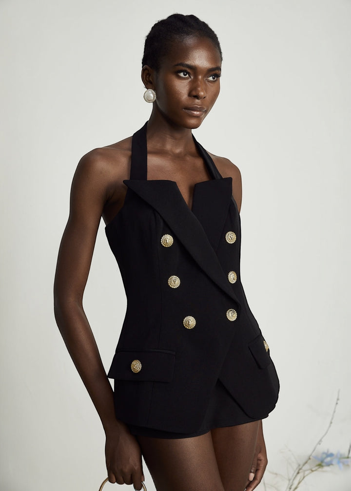 This statement top combines the structure of a tailored waistcoat with a modern halter neckline. It features a deep V-neck created by the double-breasted front, which is adorned with rows of prominent, decorative gold-toned buttons. The halter straps fasten behind the neck, leaving the back exposed and showcasing a central zipper closure. The top is fitted through the body and includes small flap pockets at the hips, adding a touch of classic tailoring. This piece offers a sophisticated and contemporary twist on a traditional design.