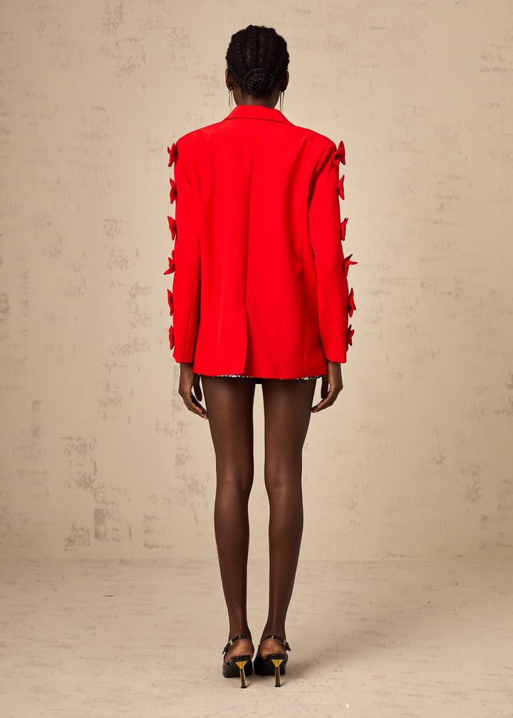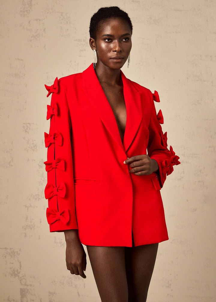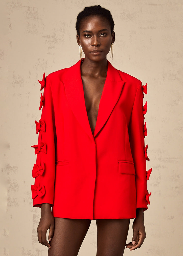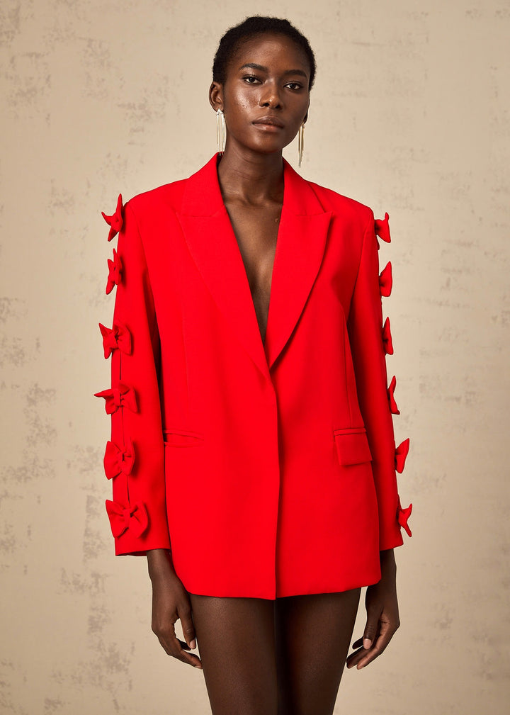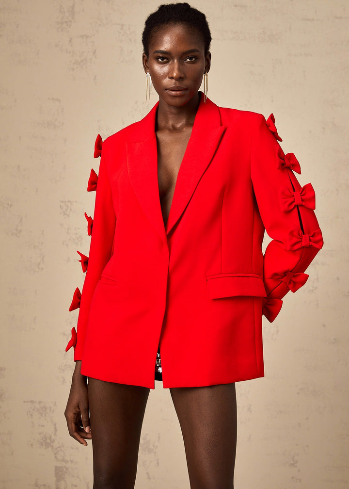 This blazer is a playful and sophisticated piece that combines a classic silhouette with a feminine and fun twist. It features a traditional single-button front closure and notched lapels. The most distinctive detail is the series of decorative bows that are placed along the outer seams of each sleeve, adding a dimensional and eye-catching element. The blazer has a tailored, slightly oversized fit, offering a relaxed yet polished look. It also includes two welt pockets at the front. This blazer is perfect for adding a touch of personality to both formal and casual outfits.