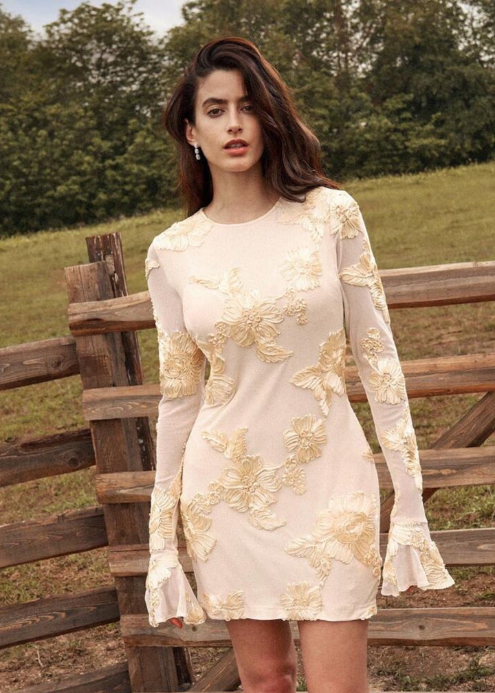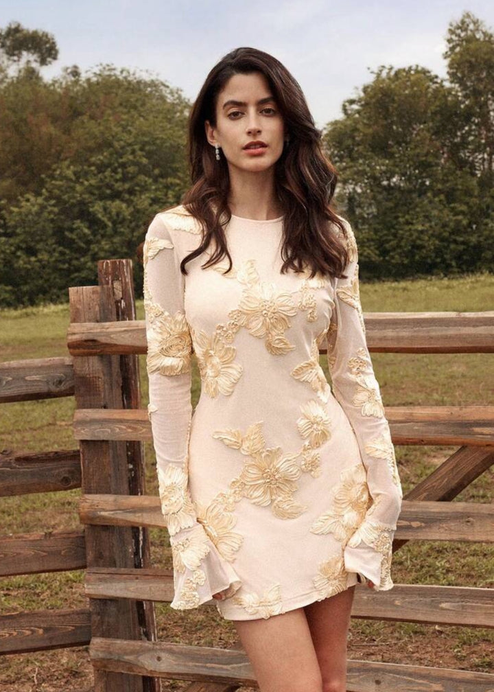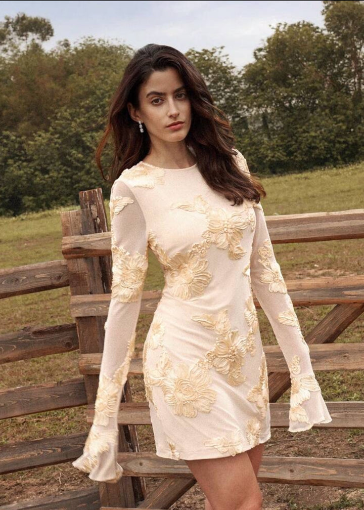 Step into a world of enchanting elegance with this stunning mini dress. The garment features a flattering mini length and a form-fitting silhouette that is both sophisticated and playful. It is adorned with long sleeves that add a touch of grace and modesty to the design. The standout feature is the intricate floral appliques, which are meticulously placed across the dress, creating a rich, textured, and three-dimensional effect. The front of the dress is designed with a modest round neckline, which contrasts beautifully with the dramatic open back, making for a memorable and captivating exit.