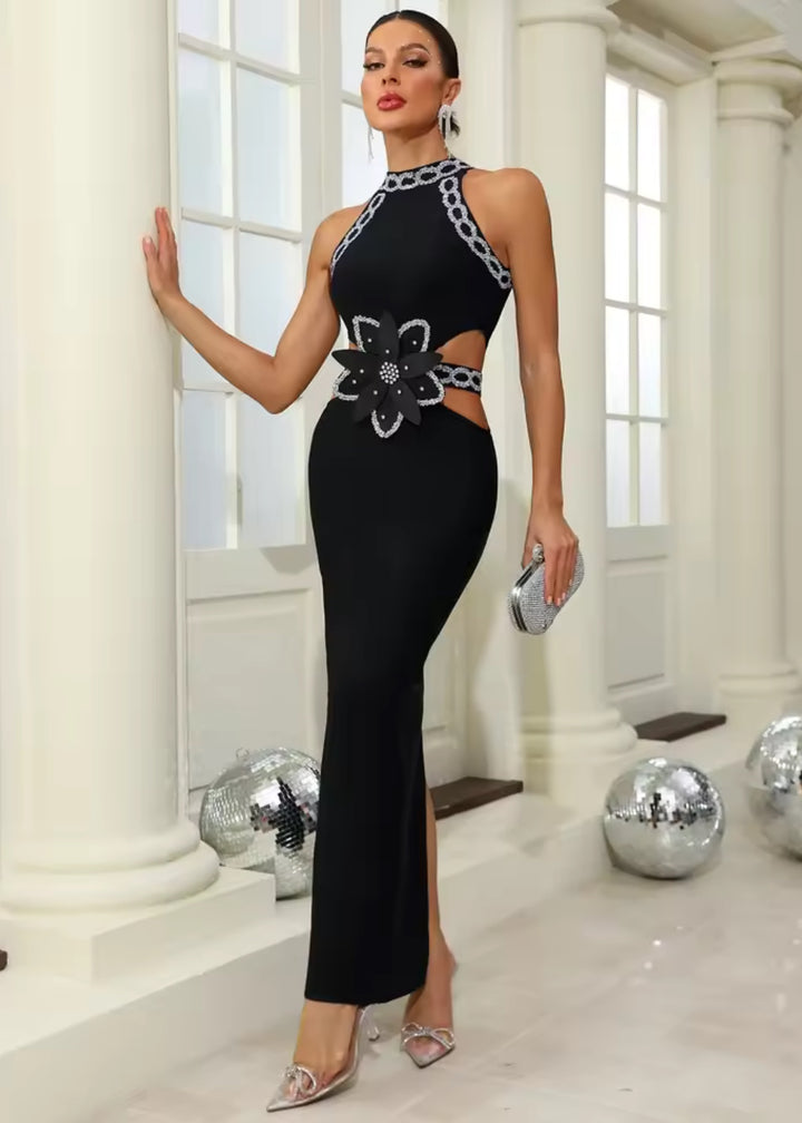 This dress is a sophisticated choice for formal occasions, blending elegance with daring details. It features a sleek maxi silhouette with a high halter neckline and a daring cutout on the midriff. The neckline and side cutouts are embellished with intricate rhinestone detailing. The centerpiece is a large, dimensional flower appliqué, also adorned with rhinestones, located on the front cutout. The dress has a discreet back zipper for a seamless fit and a subtle side slit for ease of movement.