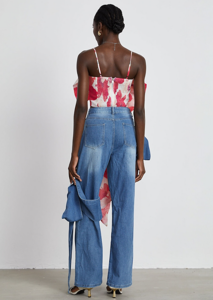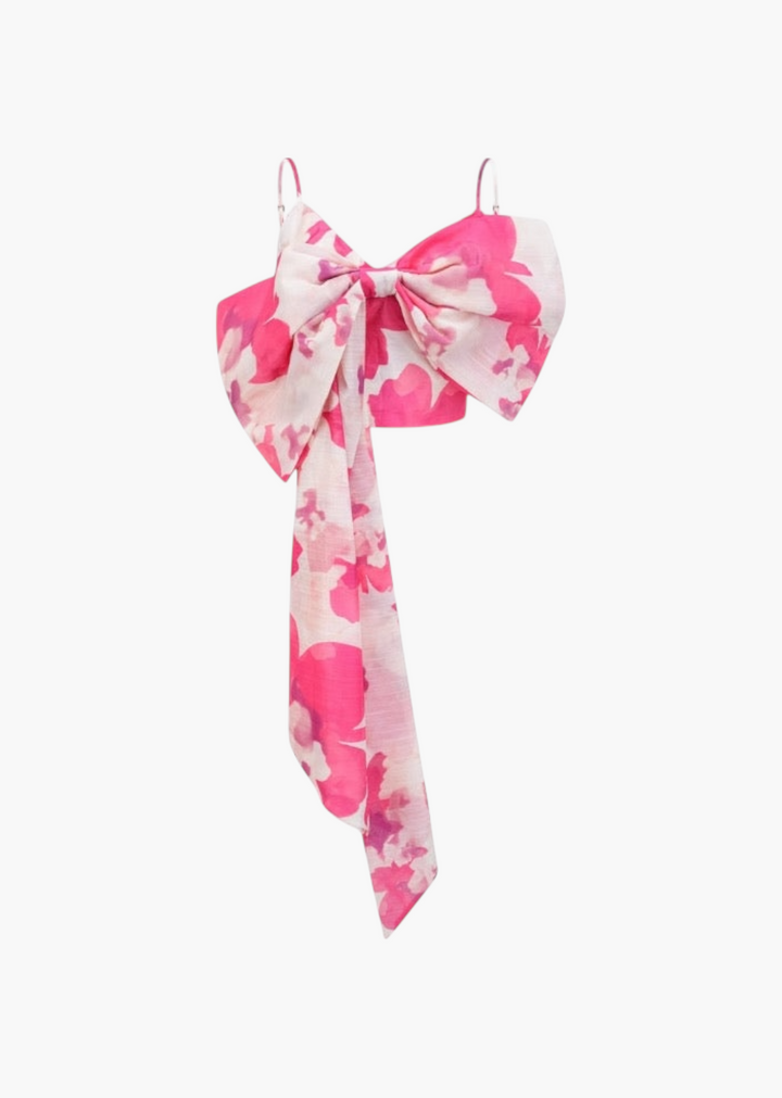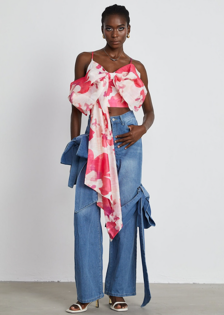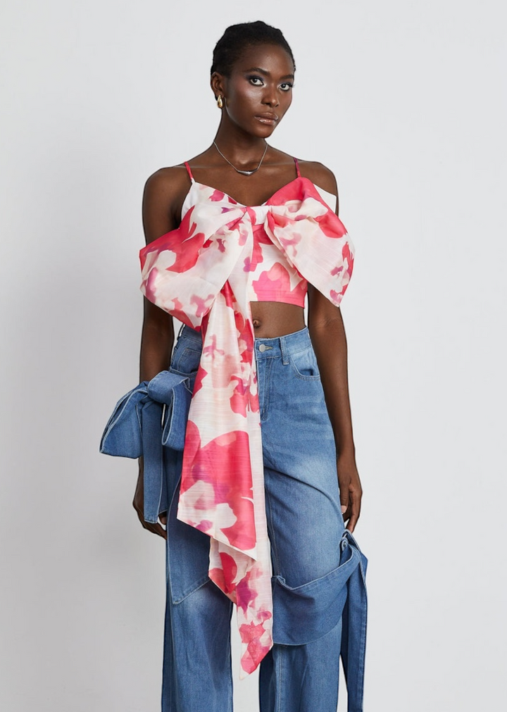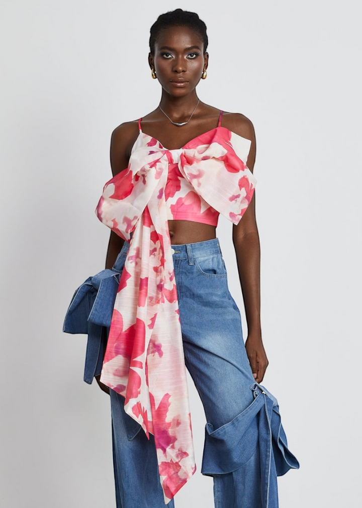 Pair this bold top with high-waisted jeans or tailored trousers to balance the cropped silhouette. For a coordinated look, match it with a skirt that picks up one of the colors in the floral print. Keep accessories minimal to allow the dramatic bow to be the focal point. Delicate jewelry and simple sandals or heels will complete the outfit.