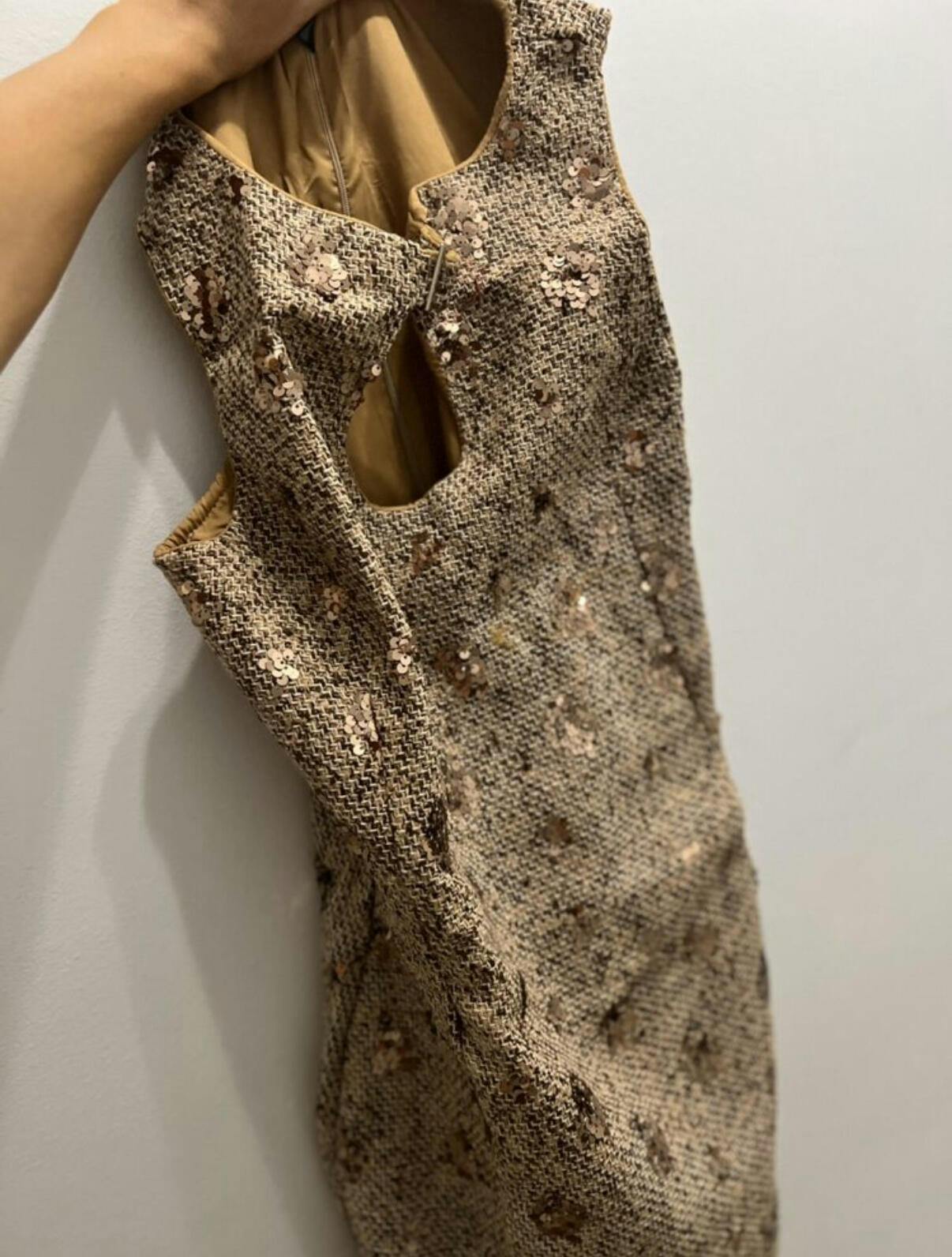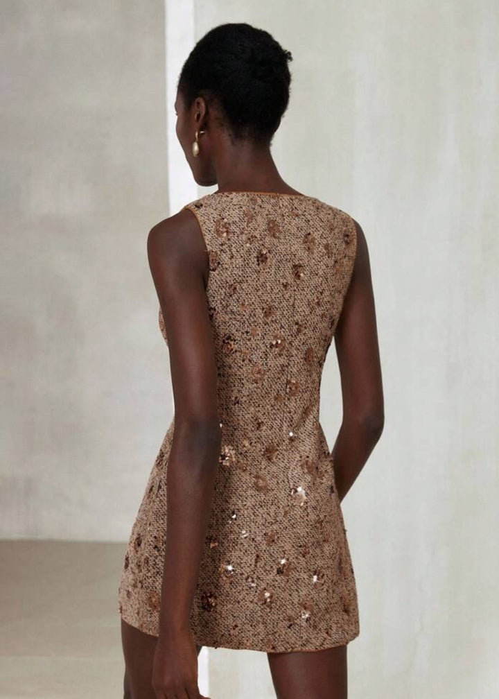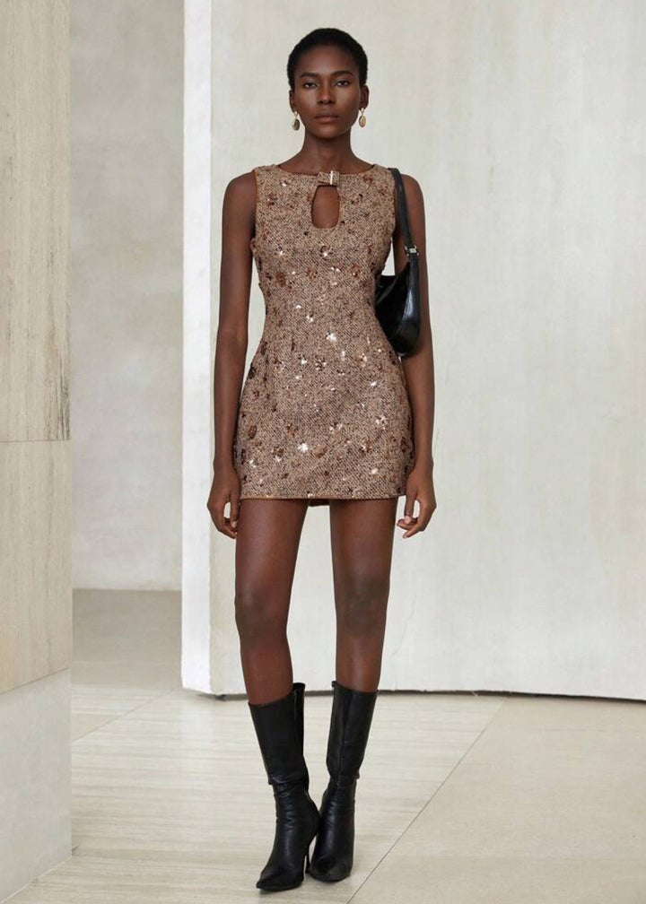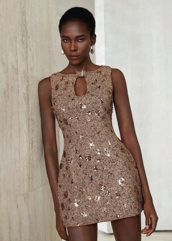 This sleeveless mini dress merges classic tweed texture with high-shine sequins for a contemporary twist on evening elegance. The fitted silhouette is accented by a keyhole neckline with a decorative clasp, creating a focal point that enhances the décolletage. Fully lined for comfort, this dress is designed for upscale events, cocktail parties, or festive occasions. Style it with drop earrings and strappy heels for a refined finish.