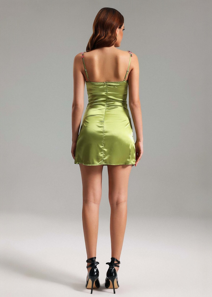This mini dress is crafted from a smooth satin fabric with a flattering A-line silhouette. The standout feature is the delicate floral embroidery on the straps and neckline, adding a romantic and feminine touch. The dress is designed with spaghetti straps and a scoop neckline, making it perfect for both day and night events.