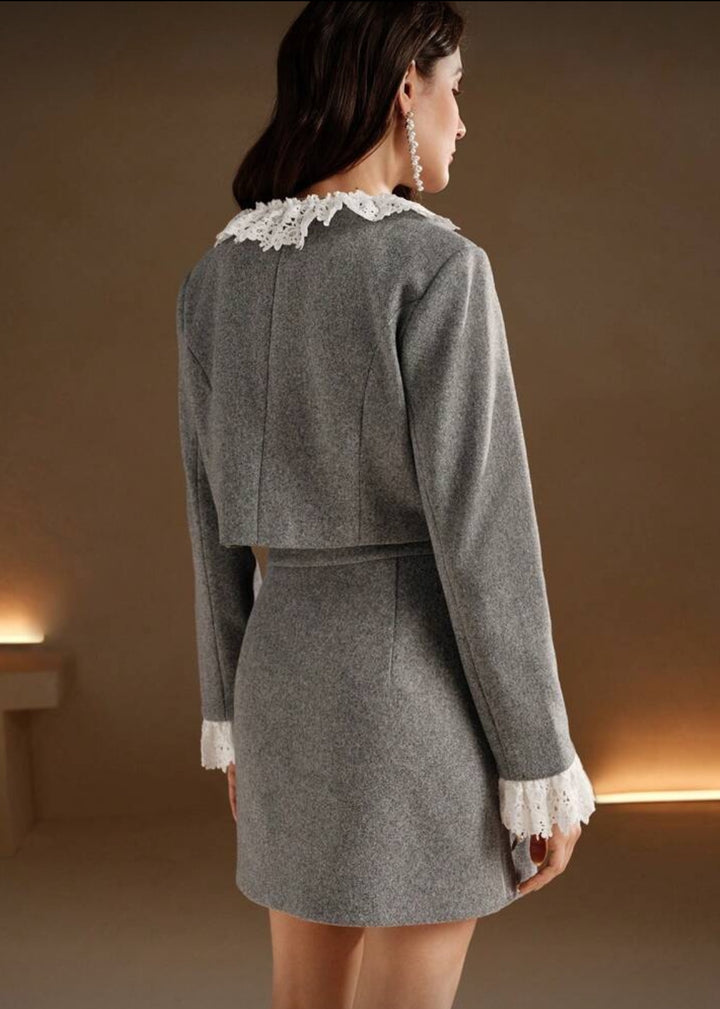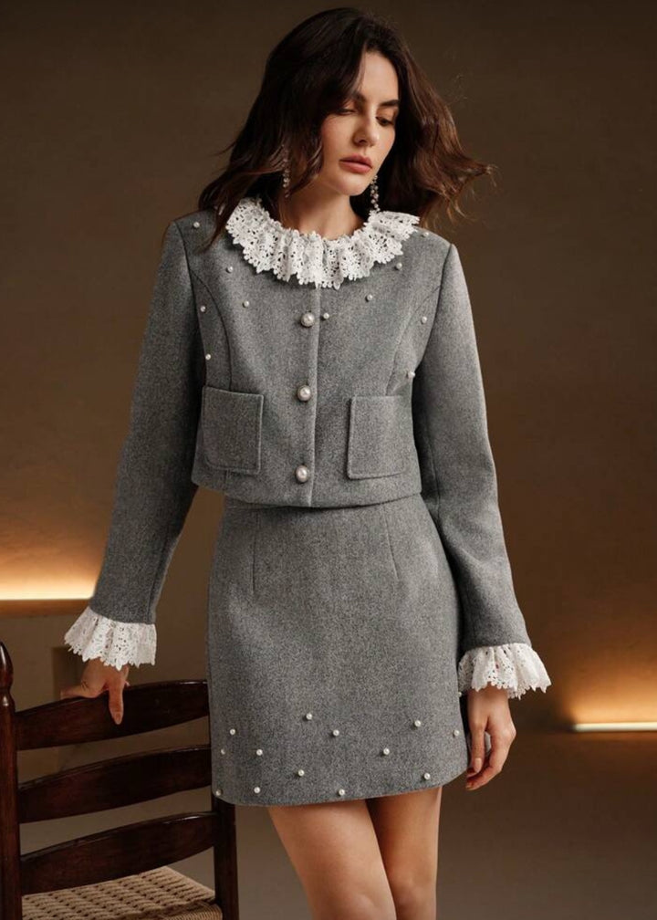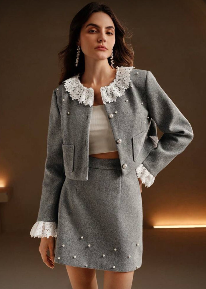 This two-piece skirt set includes a cropped jacket and a matching mini skirt, both featuring faux pearl embellishments. The jacket has a unique lace collar and cuffs, while the skirt is a high-waisted, A-line silhouette. The coordinated set creates a polished and chic look for any occasion.