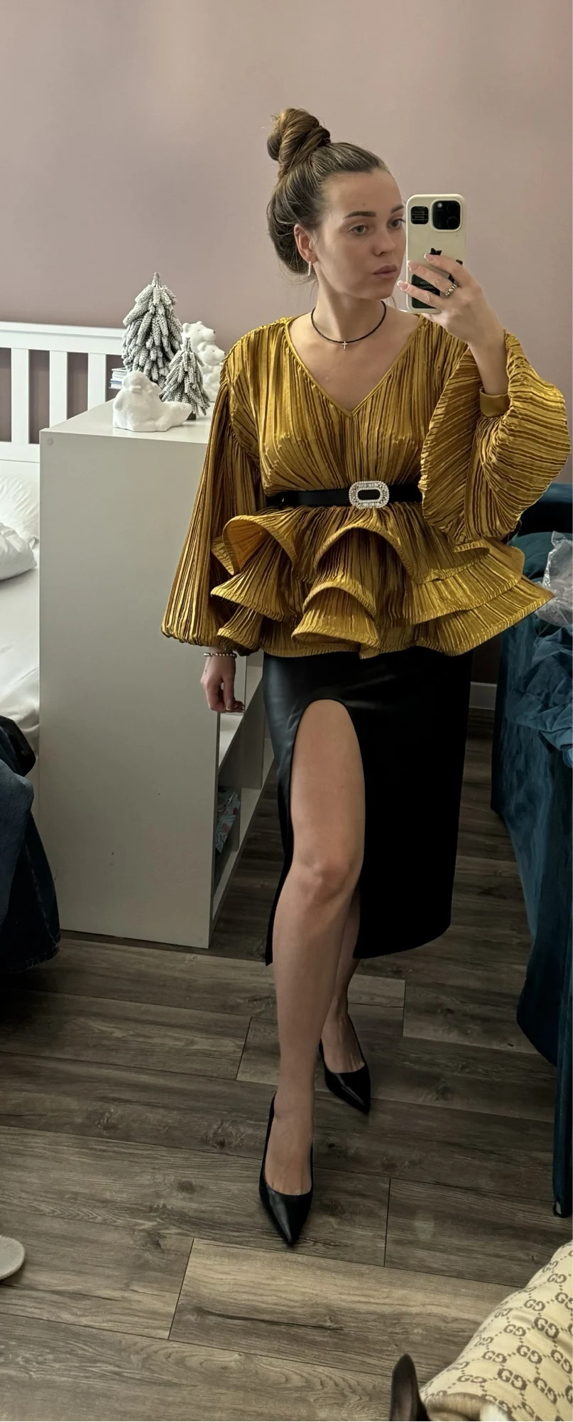 Expertly designed for effortless style, this top features a ruffle hem and pleated satin for a touch of elegance. The V-neck and long bishop sleeves add a feminine touch, while the belt detail adds a flattering silhouette. Perfect for any occasion, this top is a must-have in your wardrobe.
