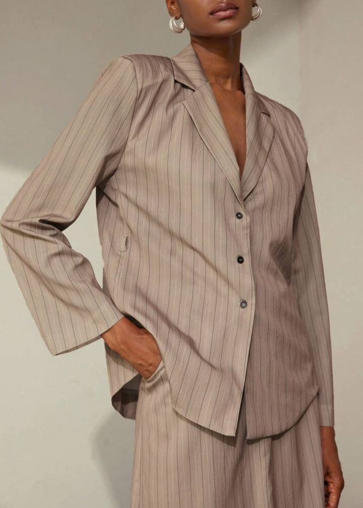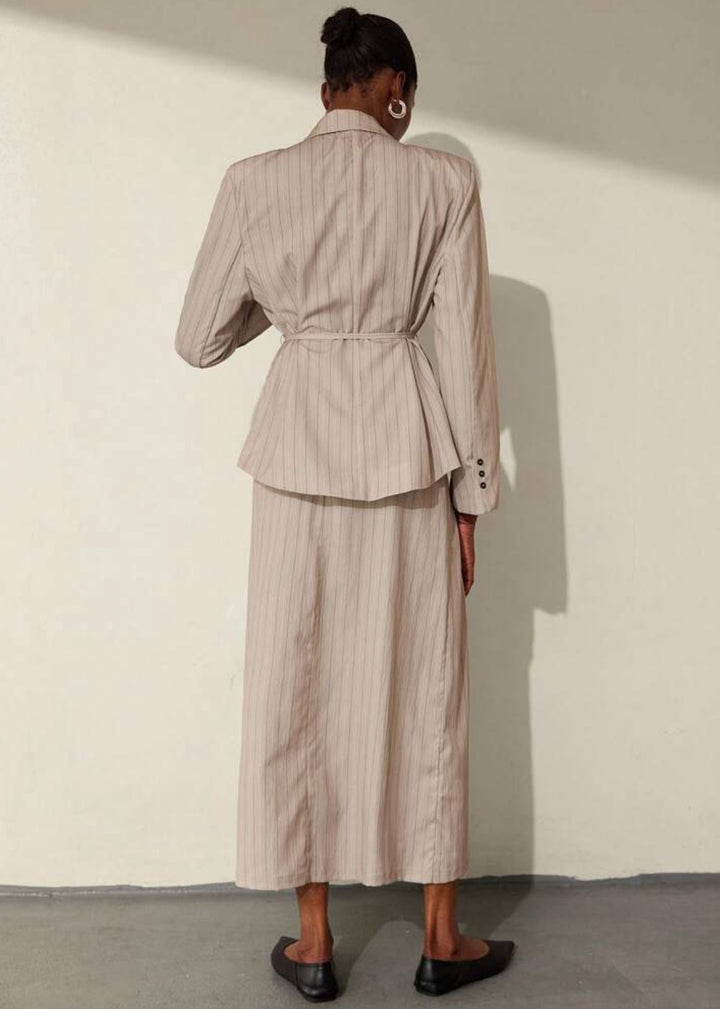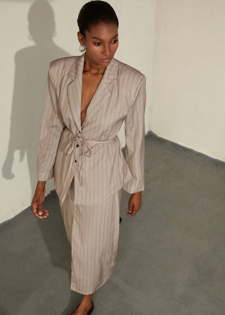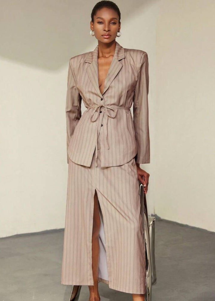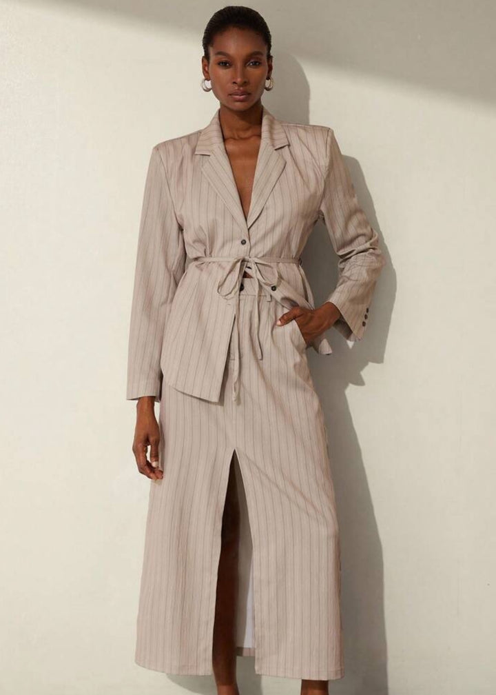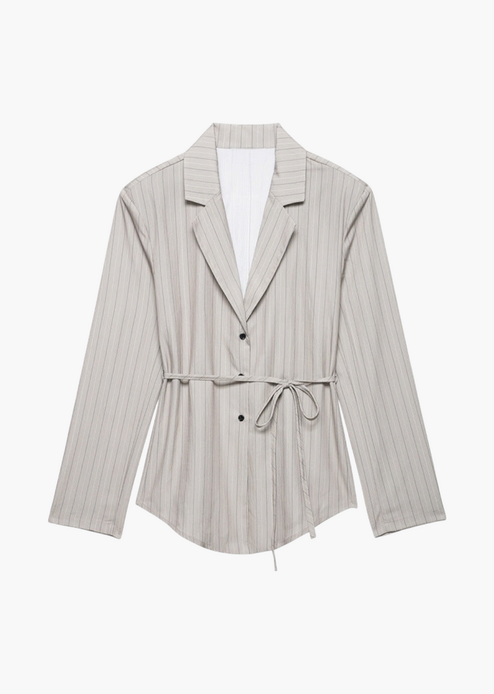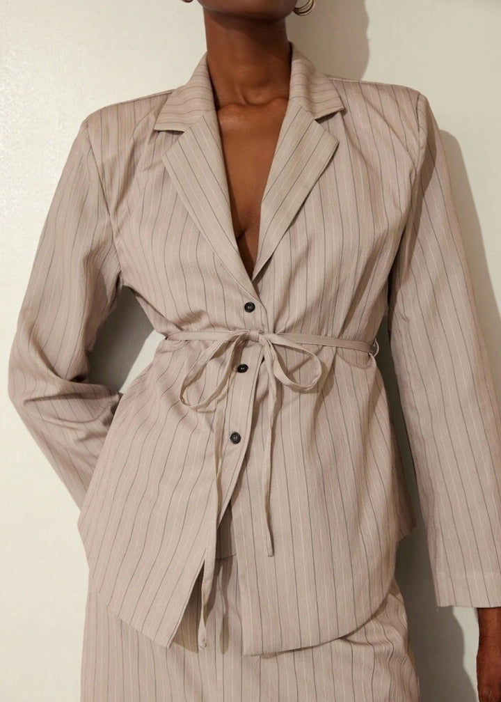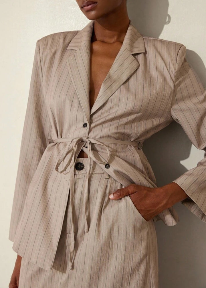 This blazer is a sophisticated and contemporary piece, featuring a classic lapel collar and a subtle pinstripe pattern that adds a touch of refined elegance. It's designed with a tie waist closure that allows for a customized, flattering fit, cinching the silhouette. The single-button front closure offers a sleek finish, making this blazer a versatile choice for both professional and stylish casual ensembles.