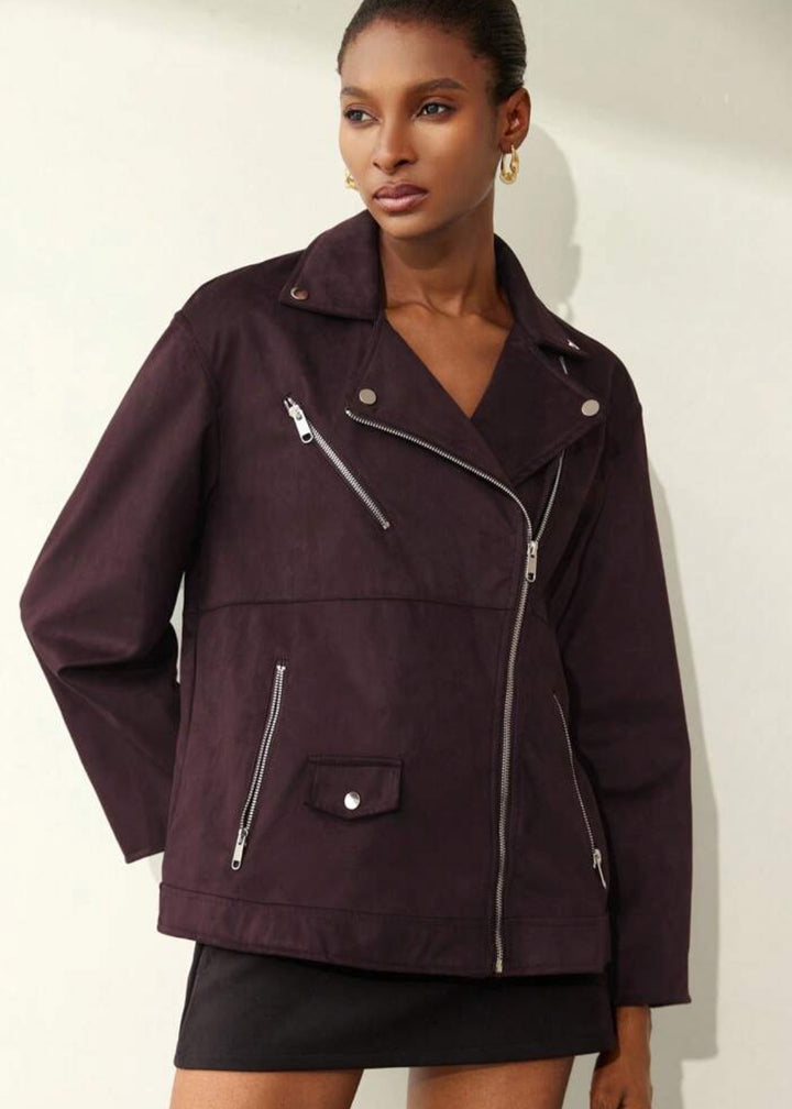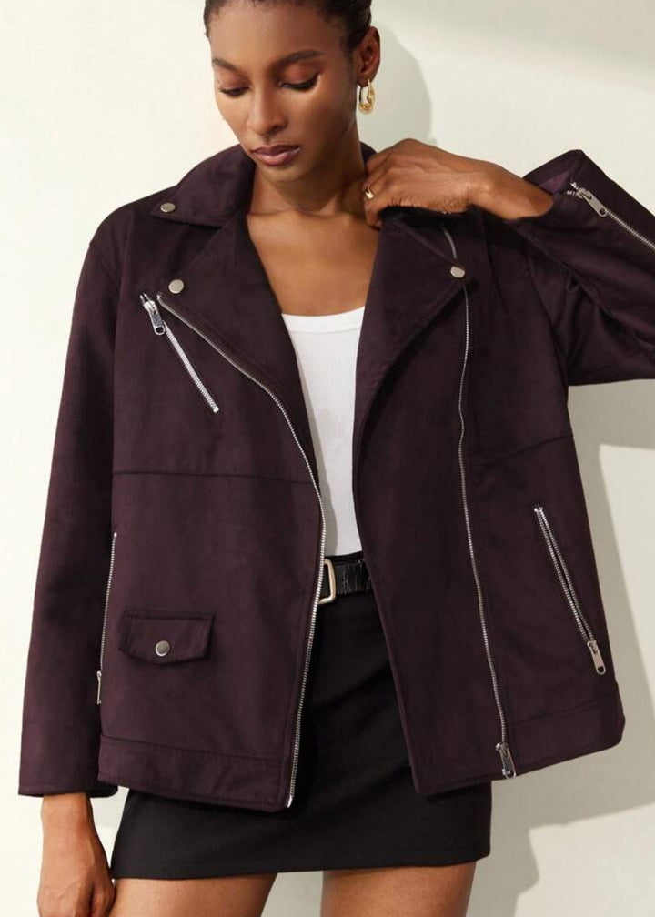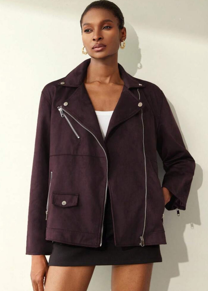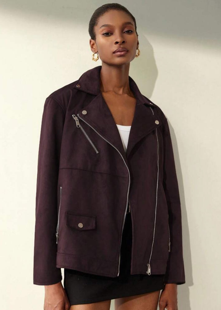 Edgy Casual: Pair with a simple t-shirt, skinny jeans, and ankle boots for a classic biker look.