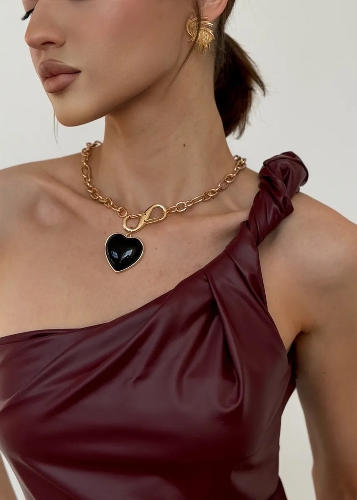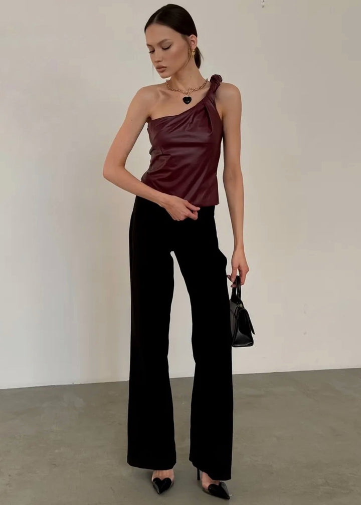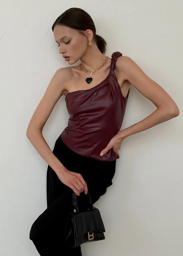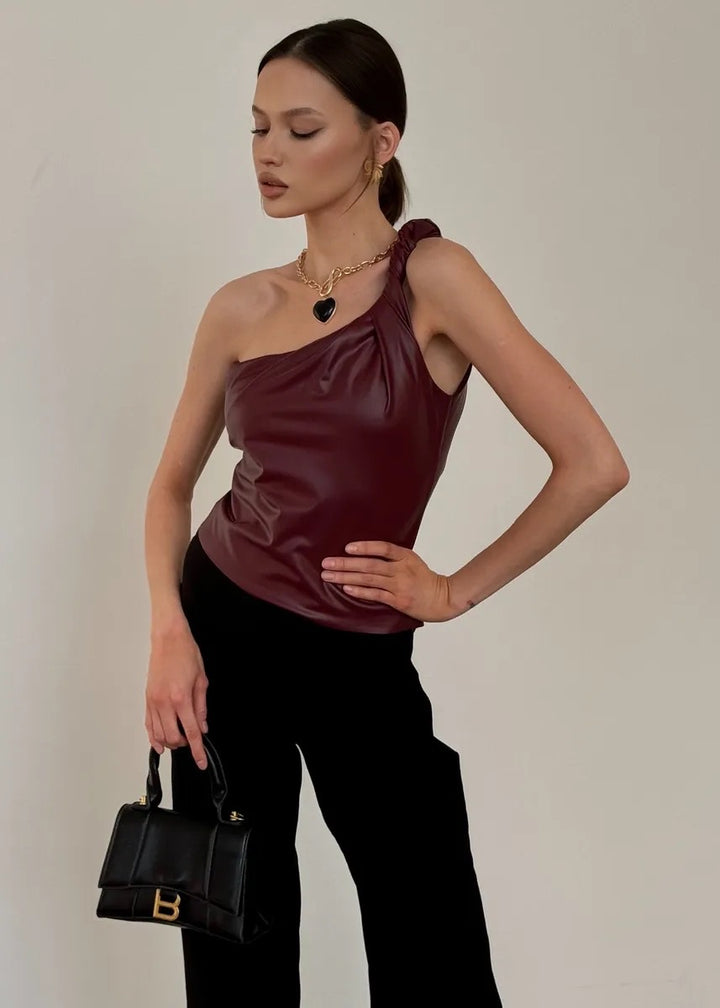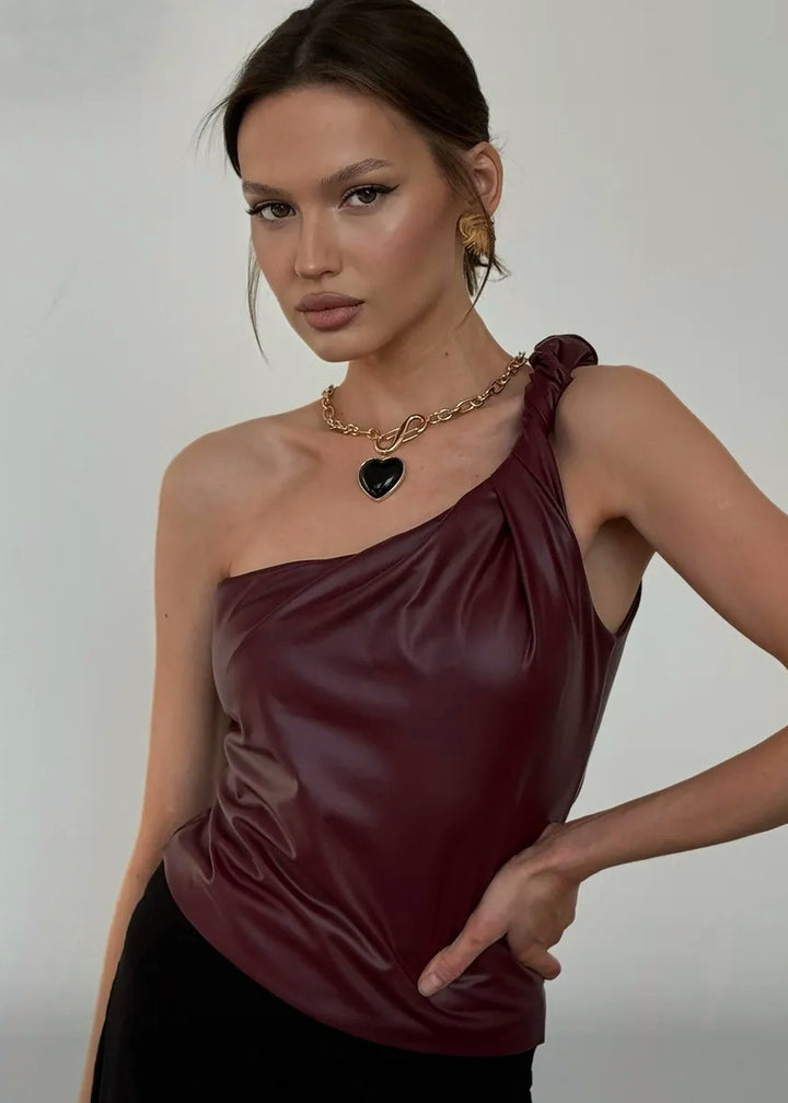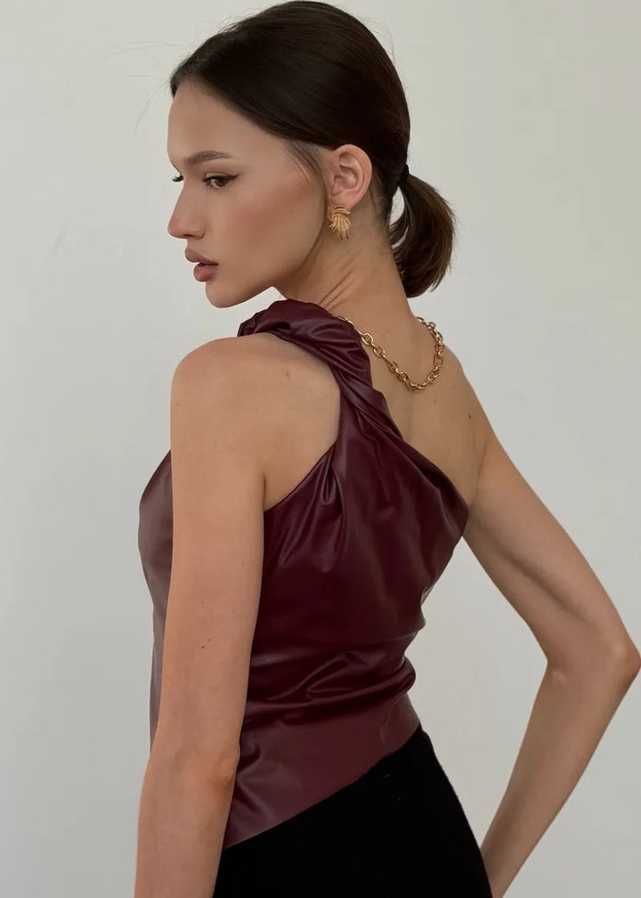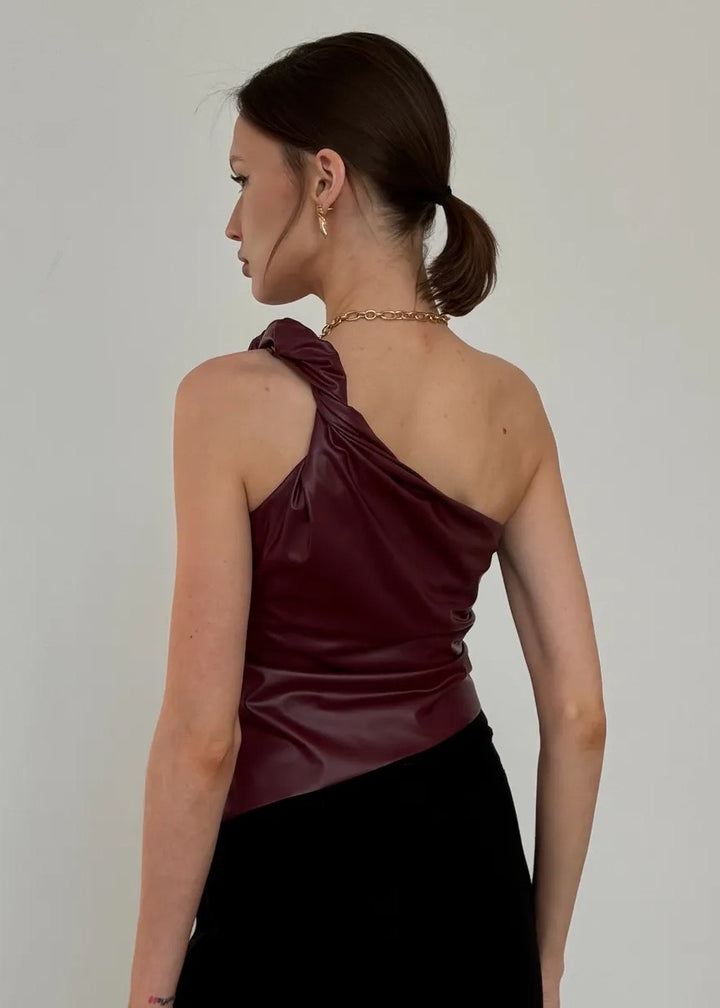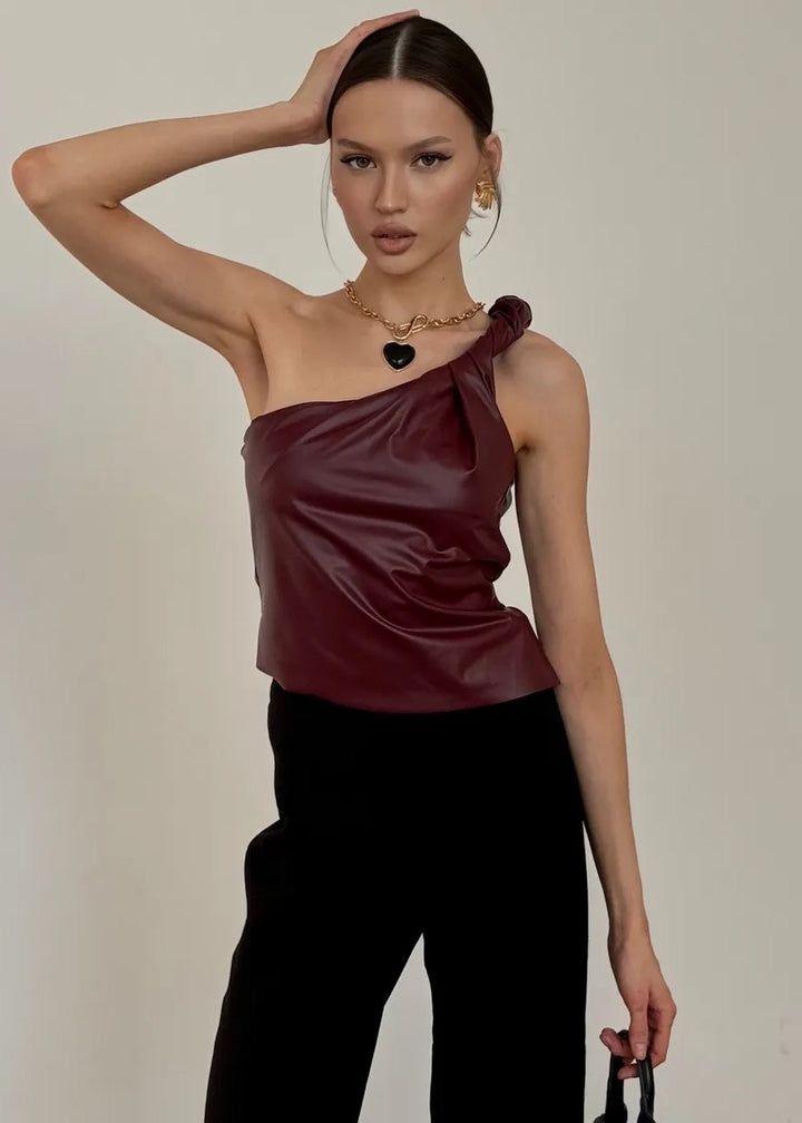 Expertly crafted from faux leather, this top boasts a chic slim fit and a striking burgundy hue. Perfect for adding a touch of edge to any outfit, this eco-friendly top exudes confidence and style.