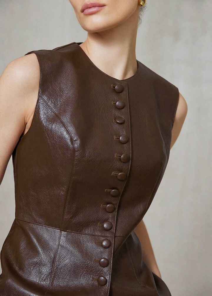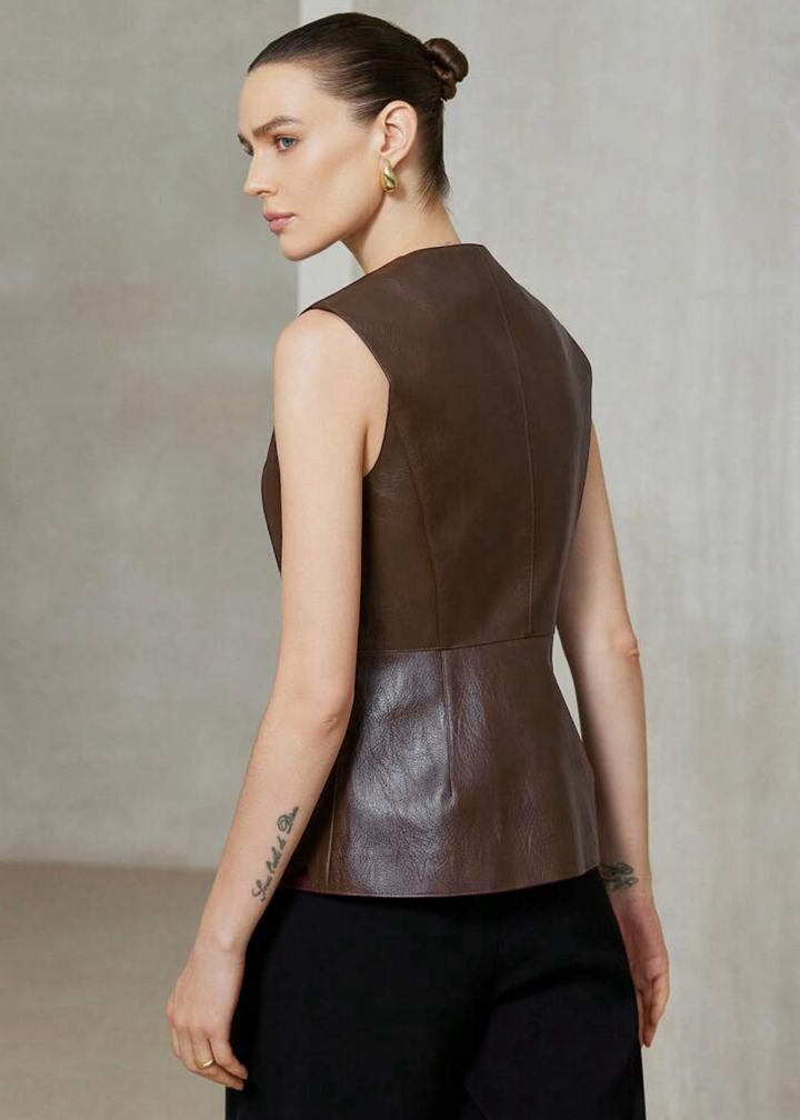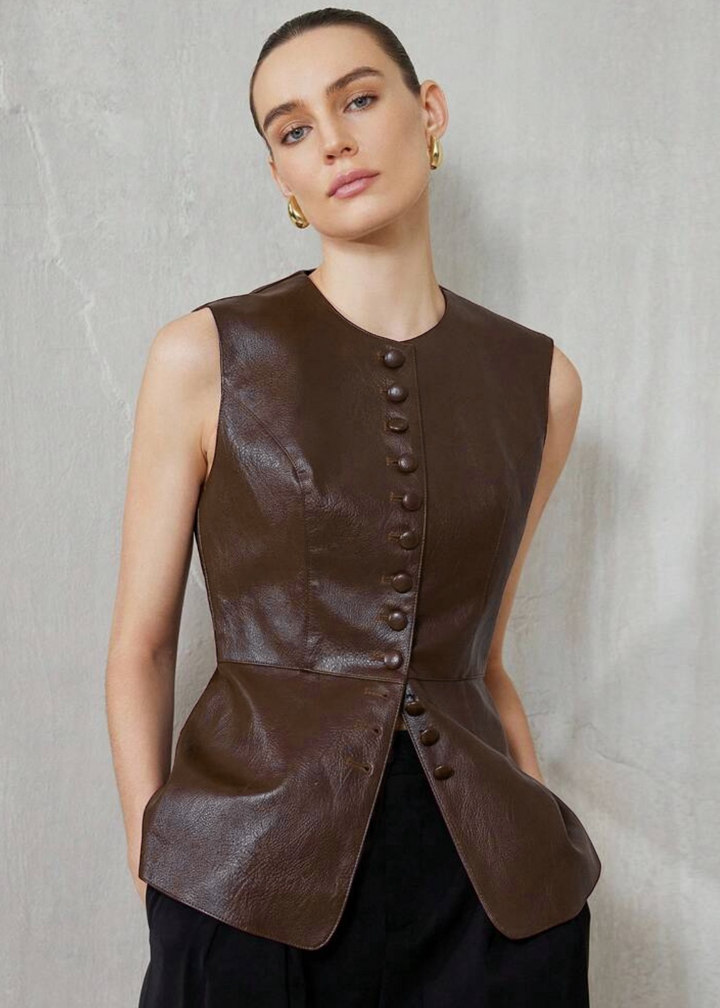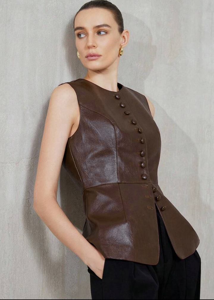 This stylish faux leather top features a round neckline and a button-front closure adorned with a unique line of self-covered buttons, creating a sophisticated and structured look. The design includes a flared peplum hem that adds a flattering silhouette and movement. This top is a versatile piece that can elevate both casual and formal ensembles,offering a modern edge.