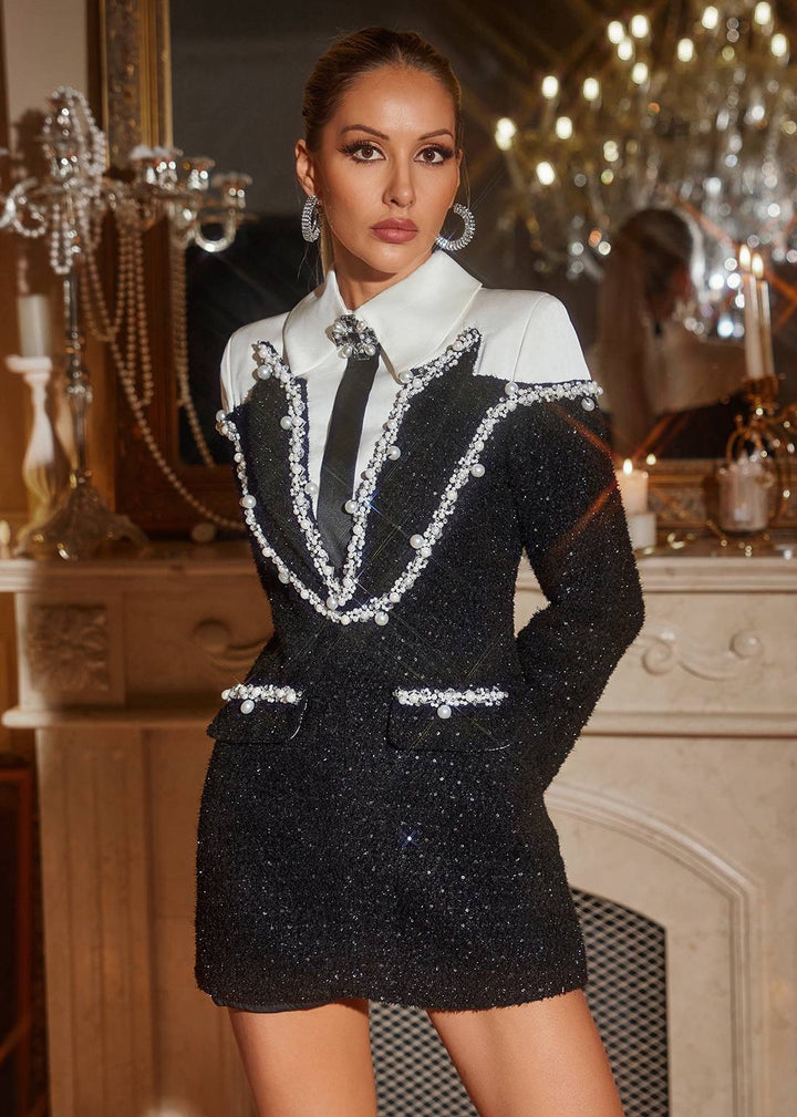 This mini dress presents a contemporary take on a timeless silhouette, designed to make a statement. It features a structured collar and a tailored bodice that flows into a straight-cut mini skirt. The garment is adorned with meticulous pearl embellishments along the shoulder line and framing the deep V-neckline, adding a luxurious dimension. Two flap pockets at the hip are also accented with pearl detailing, complementing the overall design. Crafted from a textured fabric with subtle shimmer, this dress offers both sophistication and a playful edge, ideal for various occasions.