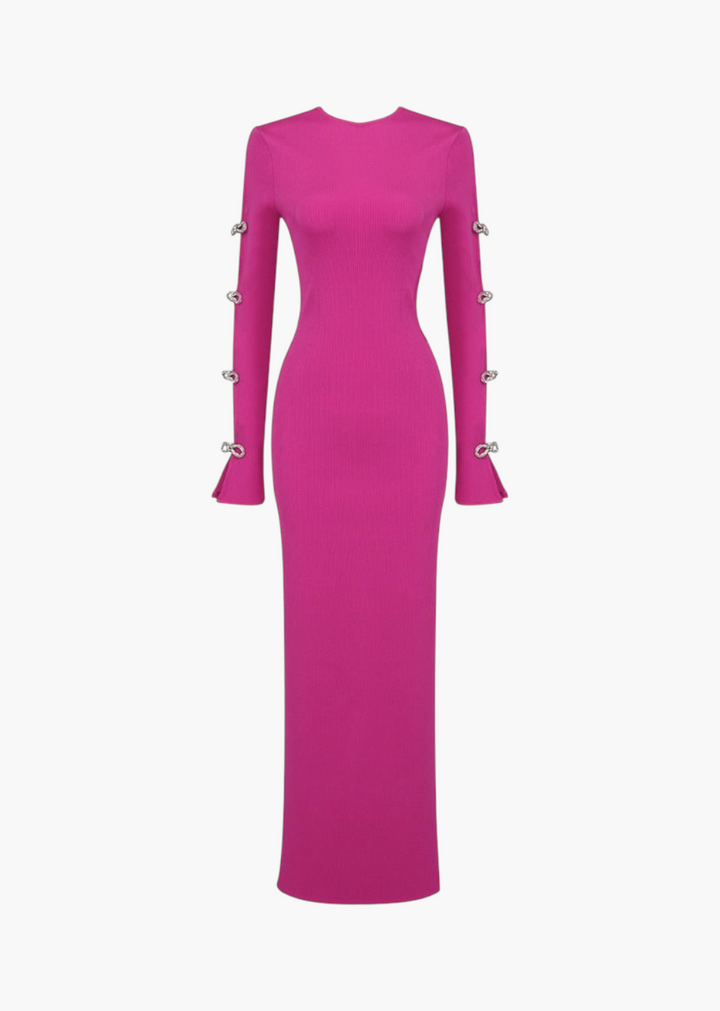 This maxi-length dress features a ribbed knit texture and a bodycon silhouette. It has a round neckline and a high-cut keyhole opening at the back. The long sleeves have cutout details with decorative rhinestone bows, and the dress is finished with a high slit at the back.