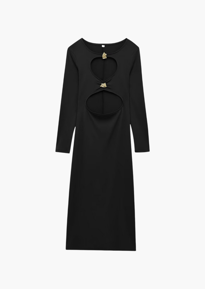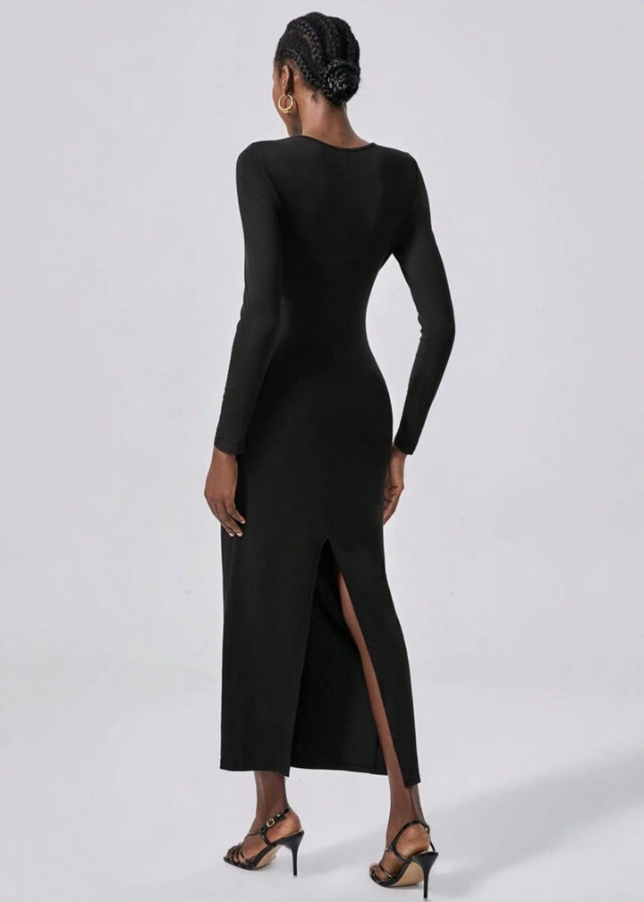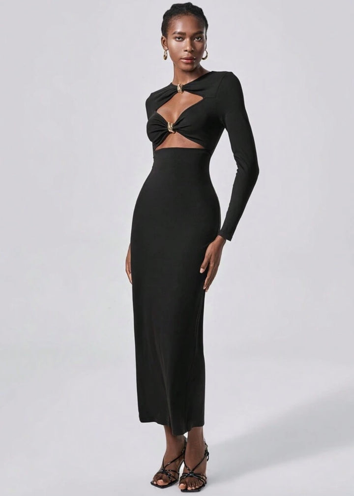 This striking maxi dress features a long-sleeve design with an intriguing front cutout, accented by a decorative clasp at the bust. The high neckline adds sophistication, while the form-fitting silhouette gracefully extends to the ankle, creating an elegant and modern look. Crafted from a comfortable, stretchy fabric, this dress is perfect for making a bold statement.