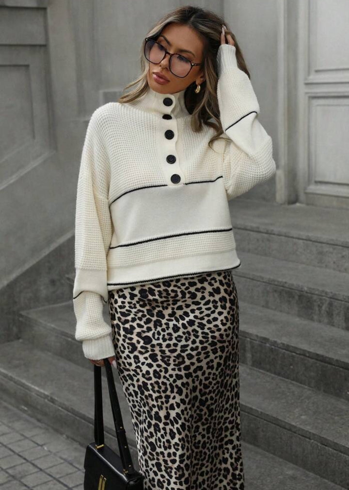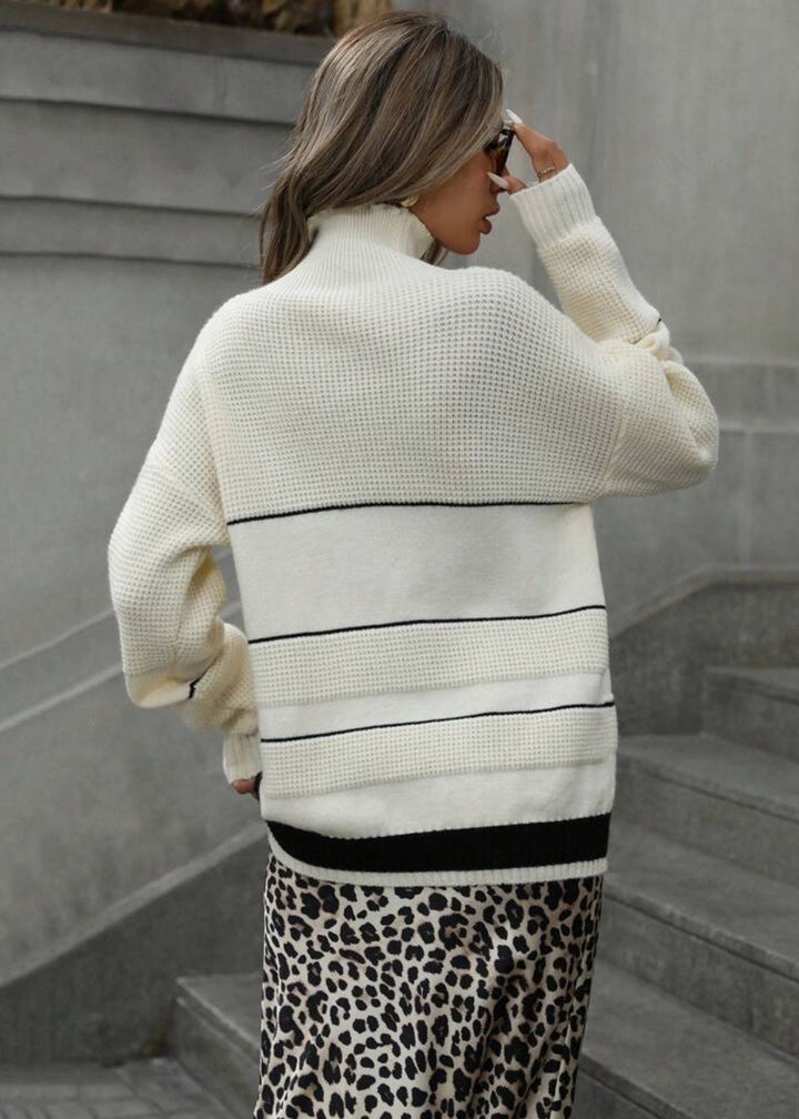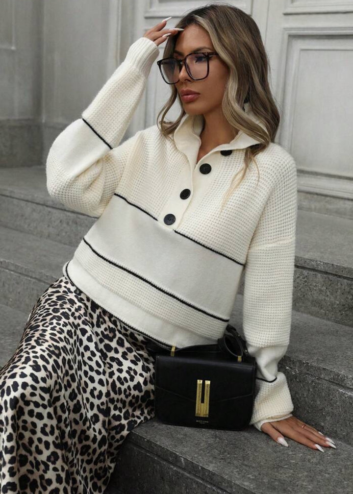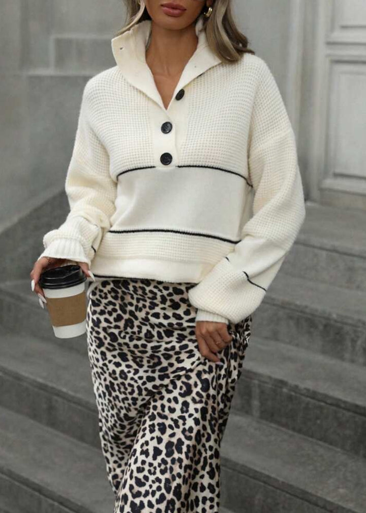 This long sleeve sweater offers a comfortable, laid-back style with a touch of sophistication. It features a unique collared neckline with button placket closure, adding a polished detail. The sweater is designed with a horizontal stripe pattern that creates a bold contrast. It is a versatile piece suitable for a range of occasions and seasons.