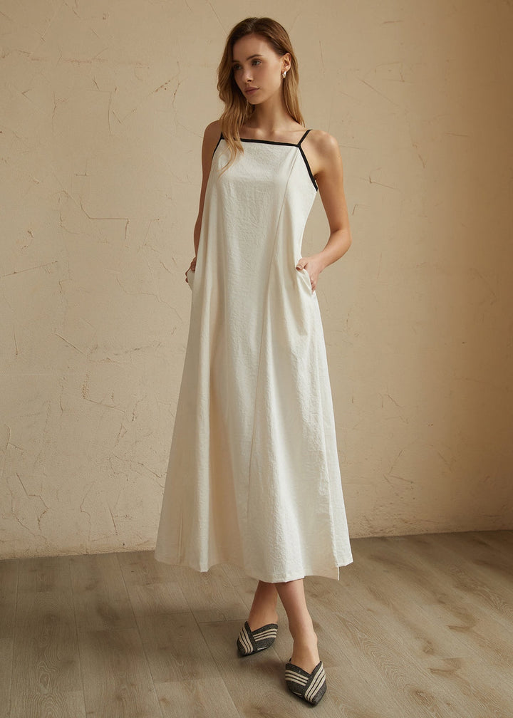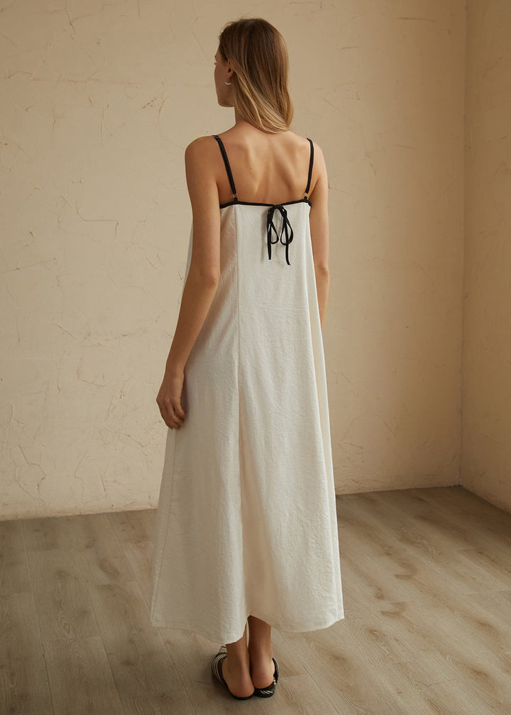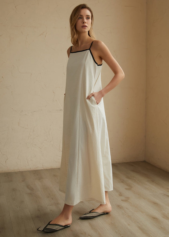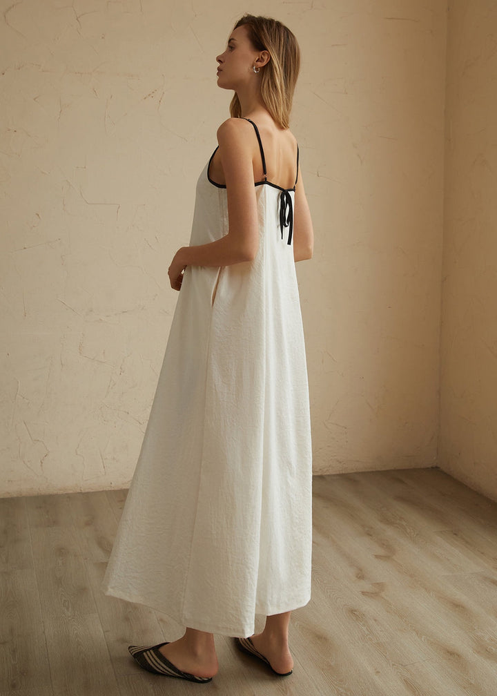 This comfortable and stylish maxi dress is perfect for relaxed days or casual outings. It features a simple square neckline and thin spaghetti straps with a contrasting trim that adds a subtle visual interest. The dress has a relaxed, flowing silhouette that falls to a maxi length, providing ease of movement. A key detail is the adjustable tie closure at the upper back, allowing for a customized fit and a touch of subtle detail. Practical side pockets offer added convenience. The lightweight fabric makes it an ideal choice for warmer weather or for comfortable loungewear.