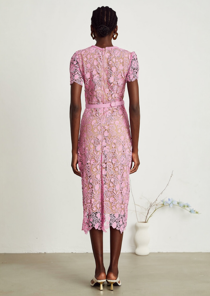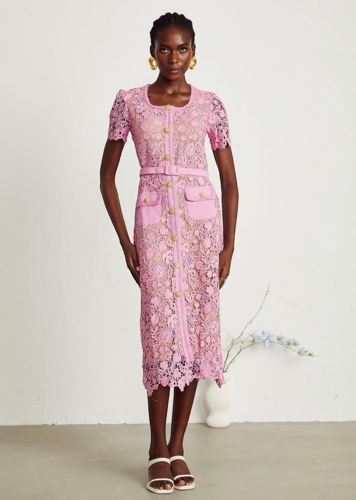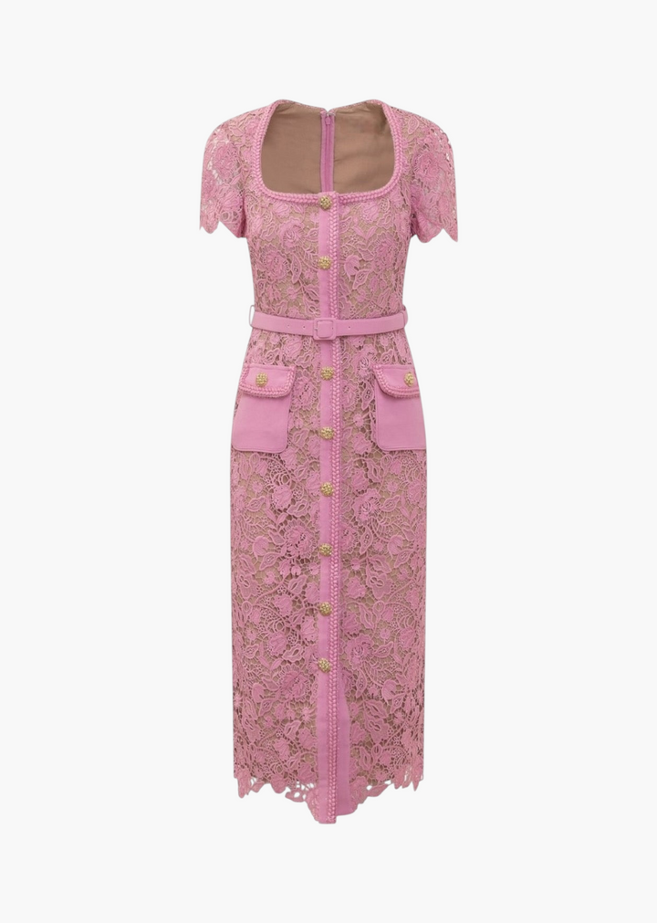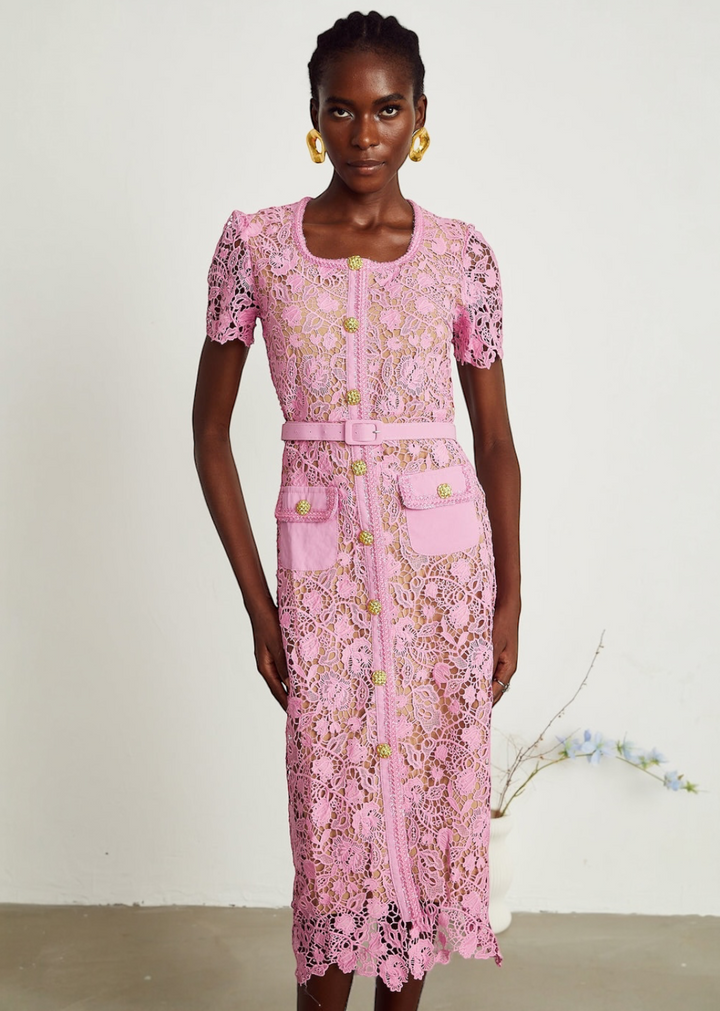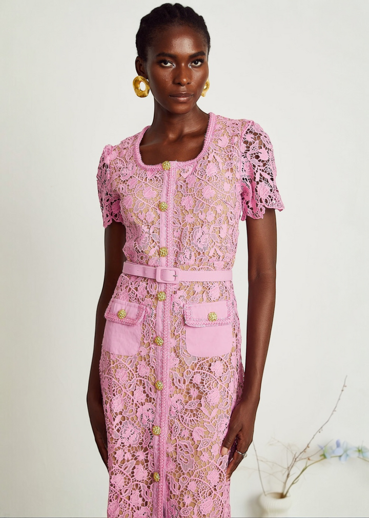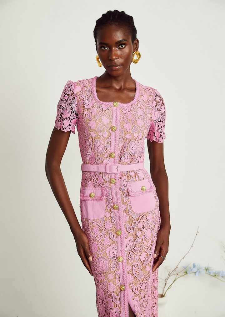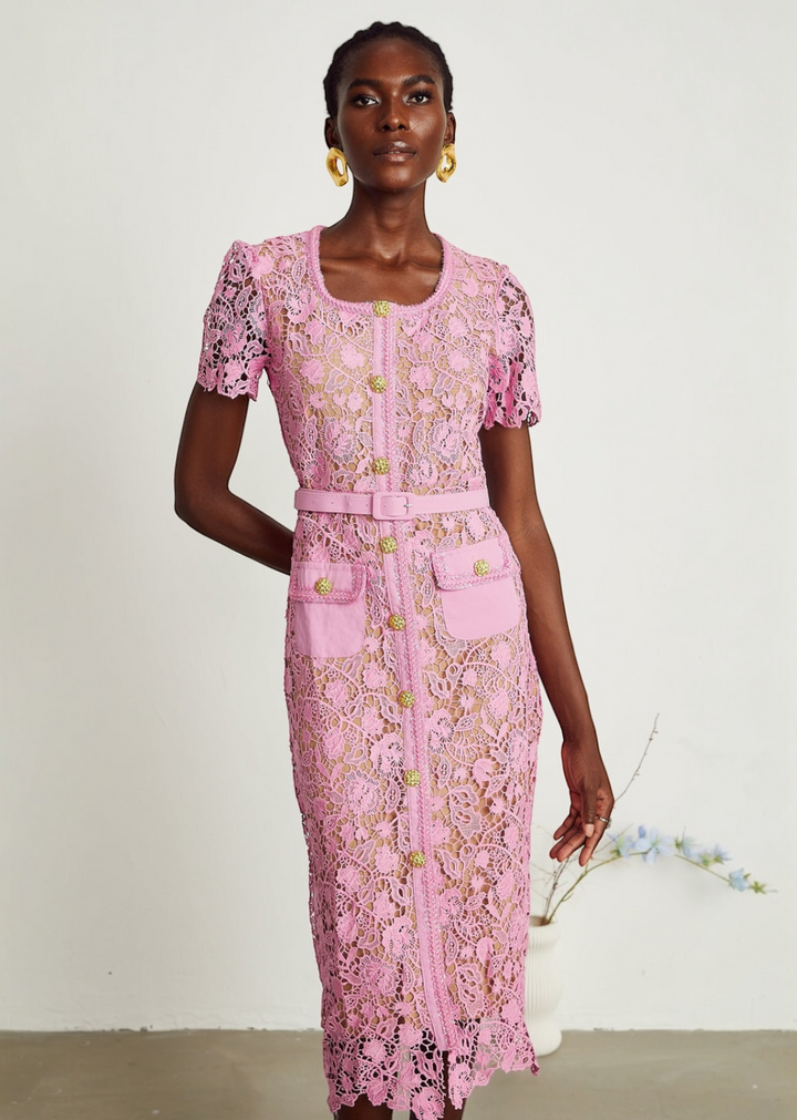 This midi-length dress is a beautiful combination of classic and contemporary details. The entire garment is covered in a delicate floral lace overlay, which is placed over a solid slip dress underneath. It features a scoop neckline, puffed short sleeves, and a column silhouette that falls to the mid-calf. A belt with gold buttons cinches the waist, adding structure and a polished touch.