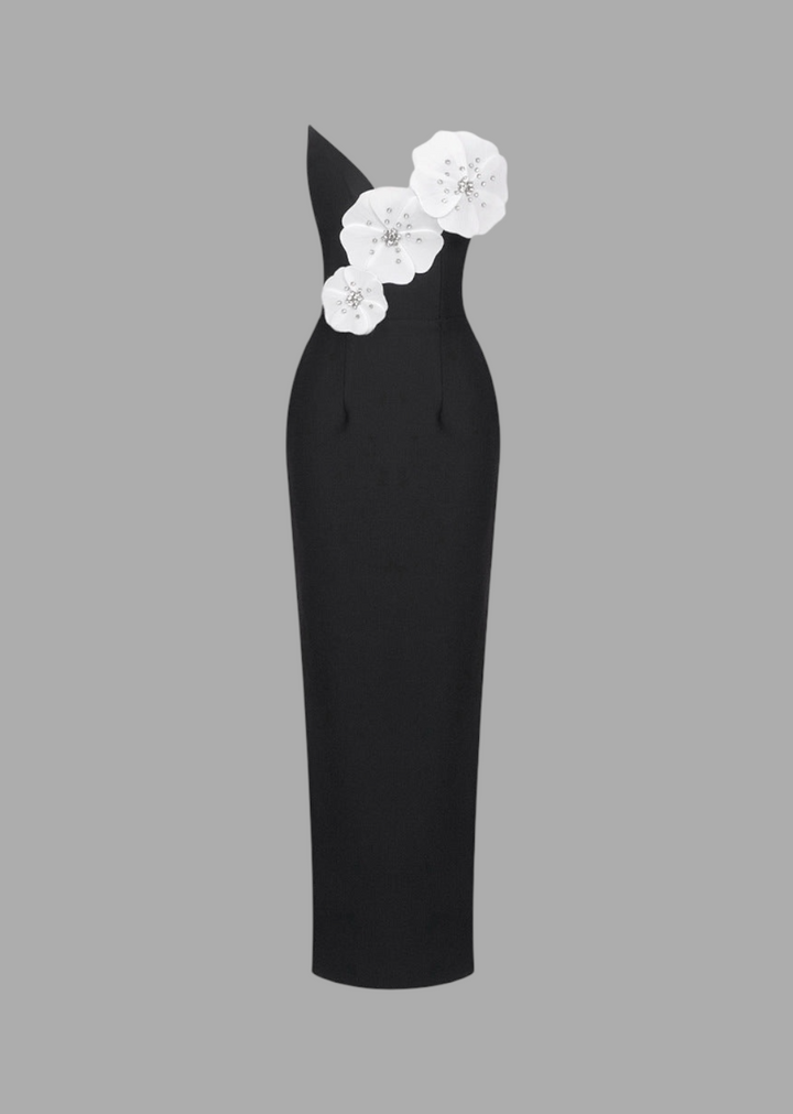 This elegant strapless gown is a masterpiece of modern sophistication, designed to make a statement at any formal event. The dress features a sweetheart neckline that gracefully frames the décolletage, leading to a fitted bodice adorned with oversized floral appliqués. These dimensional flowers add a unique and eye-catching detail, providing a touch of whimsical femininity to the sleek silhouette. The gown flows into a floor-length skirt, creating a graceful and elongated line. Crafted from a smooth, high-quality fabric, this dress is both comfortable and luxurious.