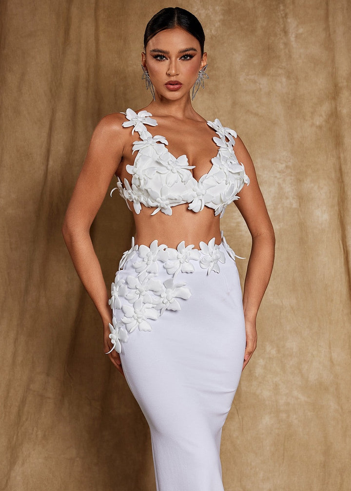 This two-piece set is a sophisticated and artistic choice for a special occasion. It features a crop top and a matching floor-length skirt, designed to create a cohesive and striking silhouette. The crop top is adorned with three-dimensional floral appliqués on the bust and straps, giving it a textural and romantic feel. The skirt is a sleek, mermaid-style design that hugs the hips and flares gracefully at the hem. It continues the floral theme with a cascade of appliqués down one side, connecting the two pieces visually. The skirt also includes a high side slit, adding movement and a touch of modern allure. This ensemble is perfect for formal events, evening galas, or as a statement look for a modern wedding guest.
