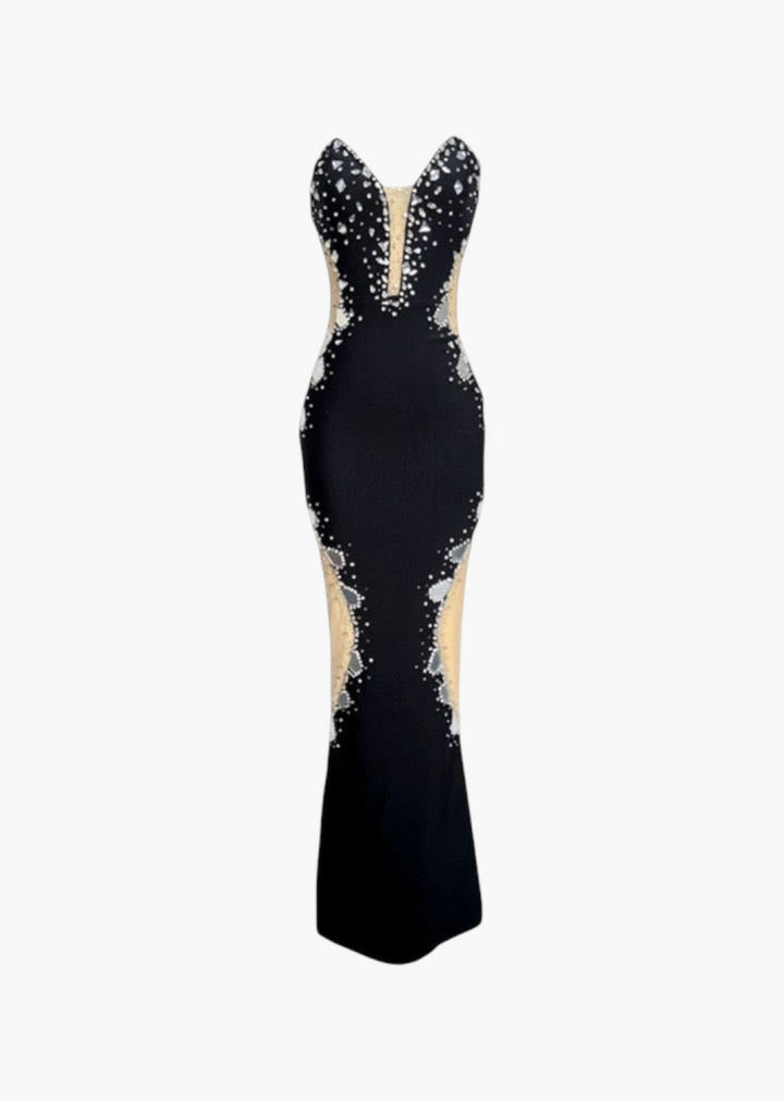 Style Tips Pair this gown with strappy high heels and a clutch. Complement the rhinestone details with sparkling earrings and a bracelet. This dress is a perfect choice for red carpet events, galas, and other formal occasions where you want to make a statement.