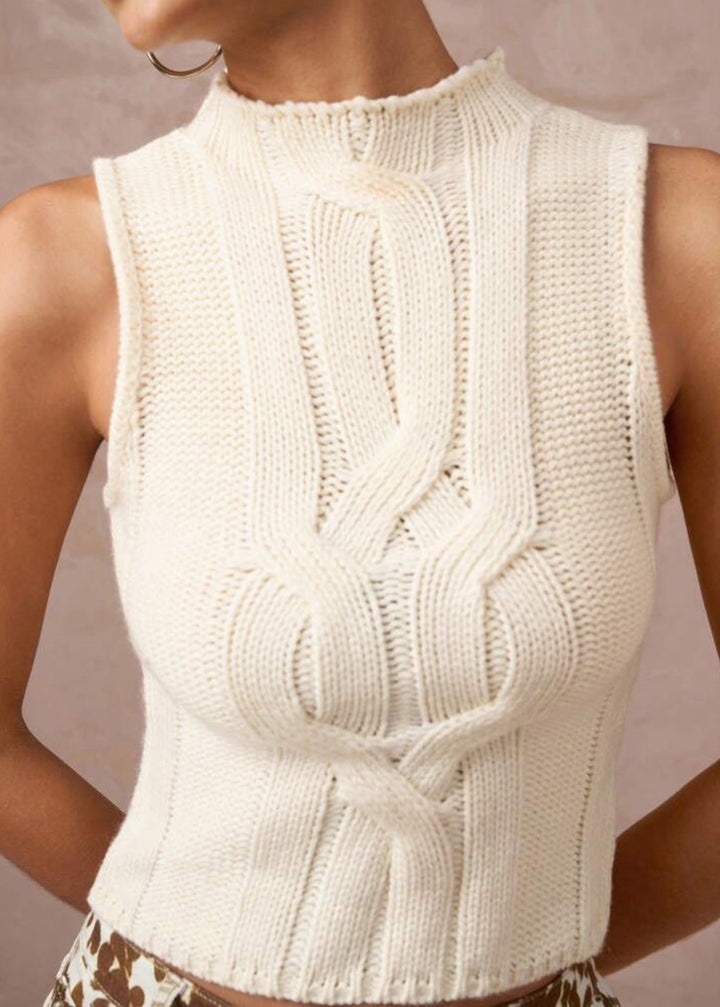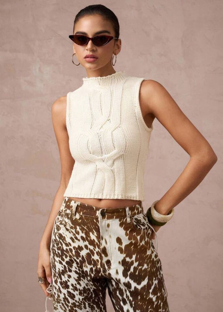 This stylish sleeveless top features a chic mock neckline and a classic cable knit pattern that adds texture and warmth.The cropped length makes it ideal for pairing with high-waisted bottoms, creating a modern and flattering silhouette.Made from a comfortable knit fabric, it's a versatile piece for layering or wearing on its own.