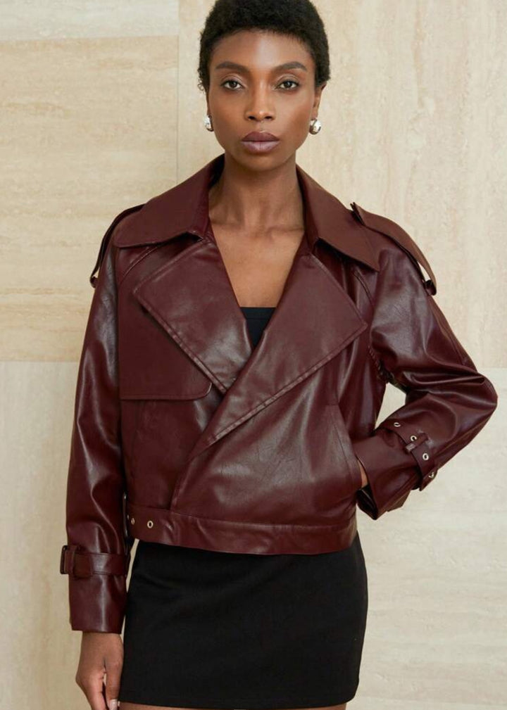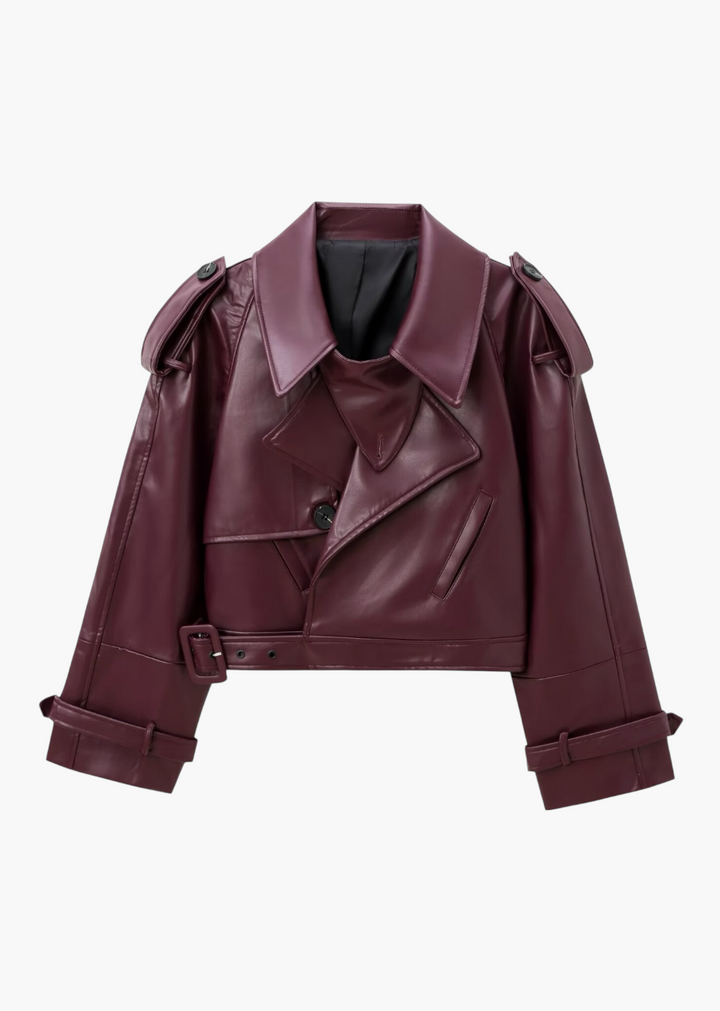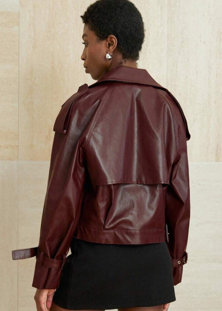 This stylish short jacket takes inspiration from a classic trench, featuring a wide lapel collar and storm flaps on the front and back for a structured look. It includes buckle strap cuffs and a belted hem, allowing for an adjustable fit and added detail. The jacket also has side pockets for functionality. This piece is perfect for adding a chic and sophisticated layer to any outfit.