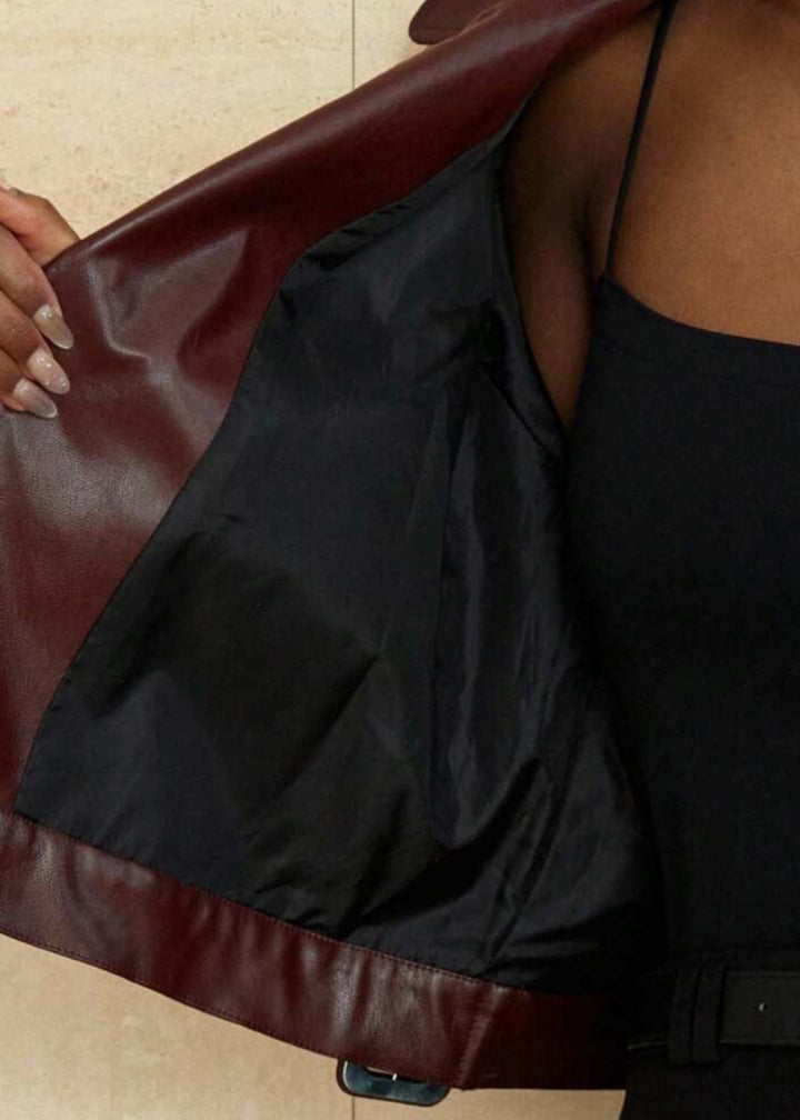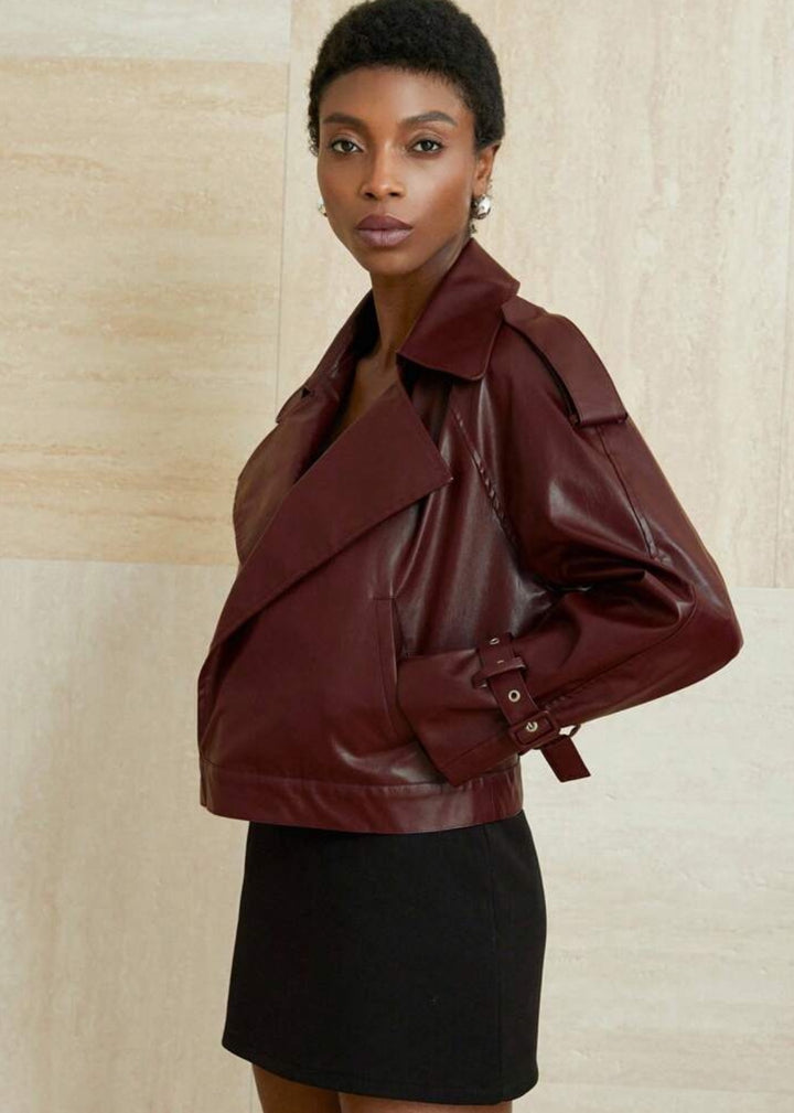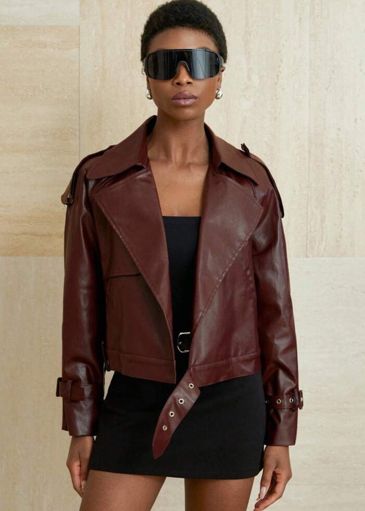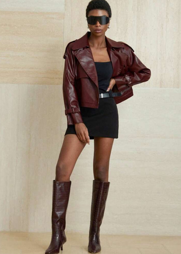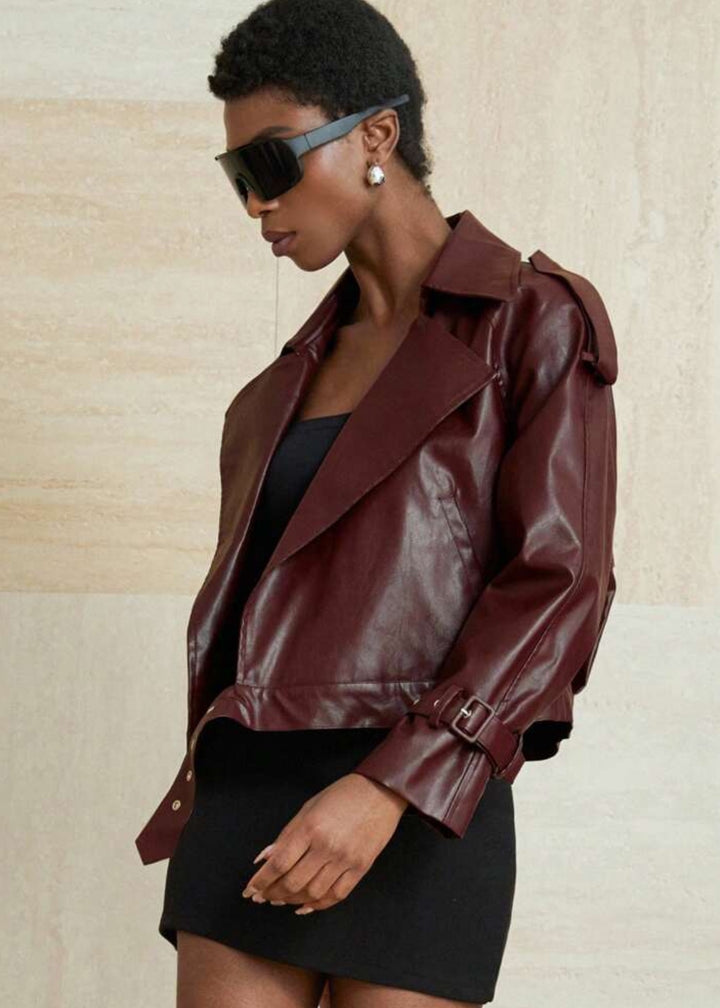 Layer this jacket over a simple top and high-waisted trousers for a sharp, office-ready look. For a more casual ensemble,pair it with a fitted dress and ankle boots. The cropped length makes it ideal for showcasing longer tops or dresses underneath.