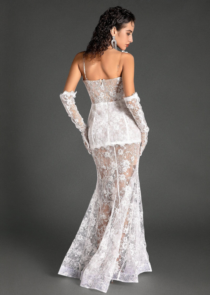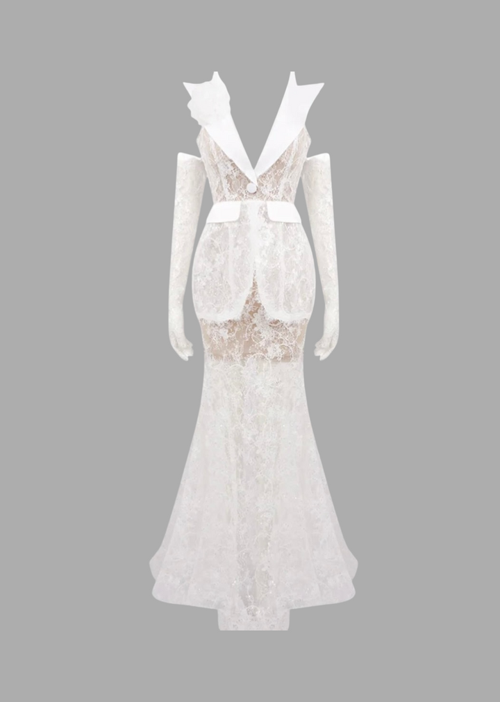 This sophisticated gown features a deep V-neckline with prominent lapels, and a floral applique on one shoulder. The bodice incorporates a structured peplum detail, creating a tailored silhouette. Crafted from intricate lace, the dress maintains a fitted shape through the body before flaring out into a mermaid silhouette, with the sheer lace revealing glimpses of the legs. The ensemble is completed with matching sheer lace opera-length gloves, adding an extra touch of elegance.