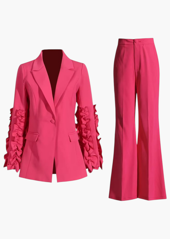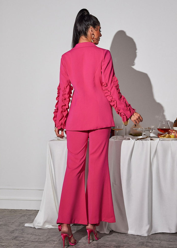 This two-piece set features a blazer and coordinating pants. The blazer has a single-button closure and a notched lapel. The sleeves are the focal point, with cascading ruched ruffles that add a sculptural detail. The pants have a high-waisted design with a flared leg and a concealed zipper closure.