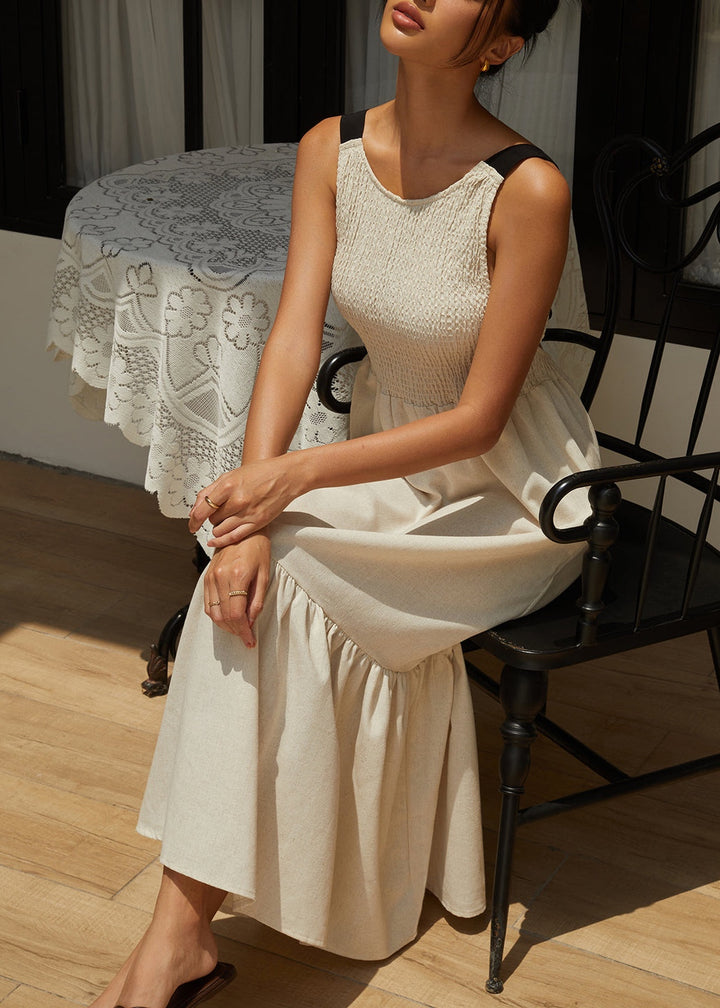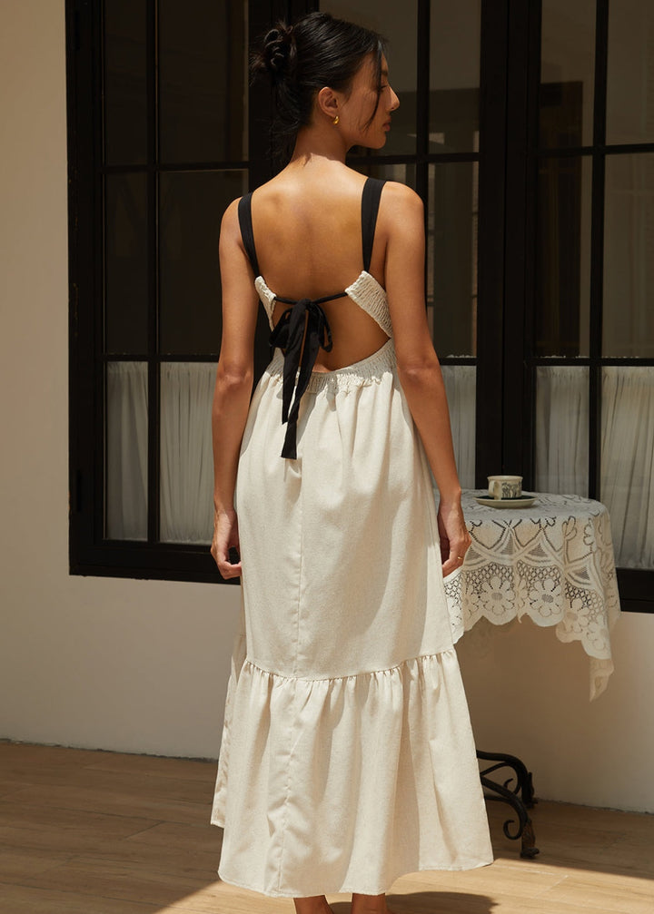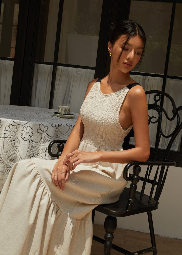 This maxi dress features a textured, smocked bodice for a comfortable and figure-flattering fit. The high, round neckline and wide straps create a classic silhouette from the front. The back is designed with an open-back detail, secured with a self-tie bow at the waist for an adjustable fit and a touch of playful elegance. The flowing skirt is crafted from a soft, woven fabric and falls to a tiered hemline with a subtle ruffle, adding movement and grace to every step. The dress is ankle-length, making it perfect for a variety of occasions.