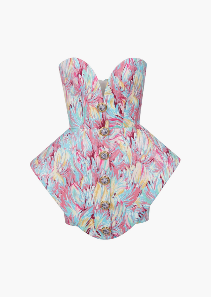 This modern mini dress features a strapless sweetheart neckline and a structured bodice. The design is characterized by an asymmetrical, peplum-style overskirt with a pointed hemline. The front is detailed with a series of buttons running down the center. The back features a concealed zipper closure for a seamless and secure fit. This dress offers a unique silhouette, making it a standout choice for parties, cocktail events, or any occasion that calls for a fashion-forward look.