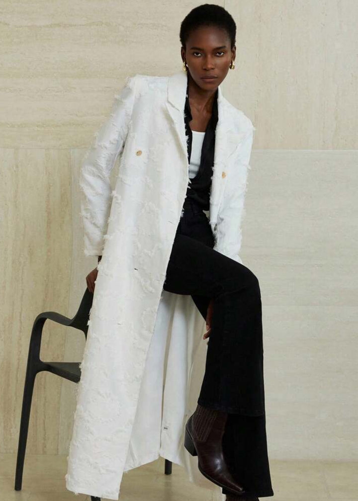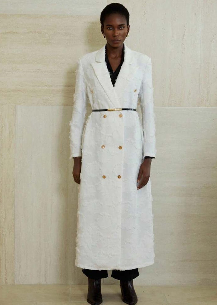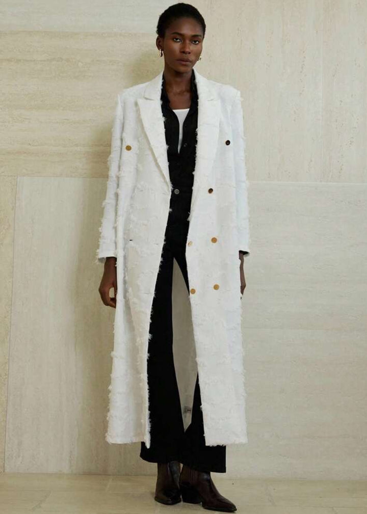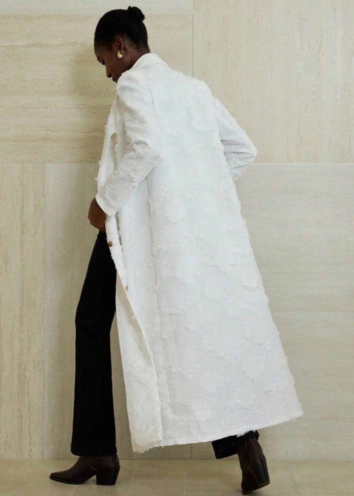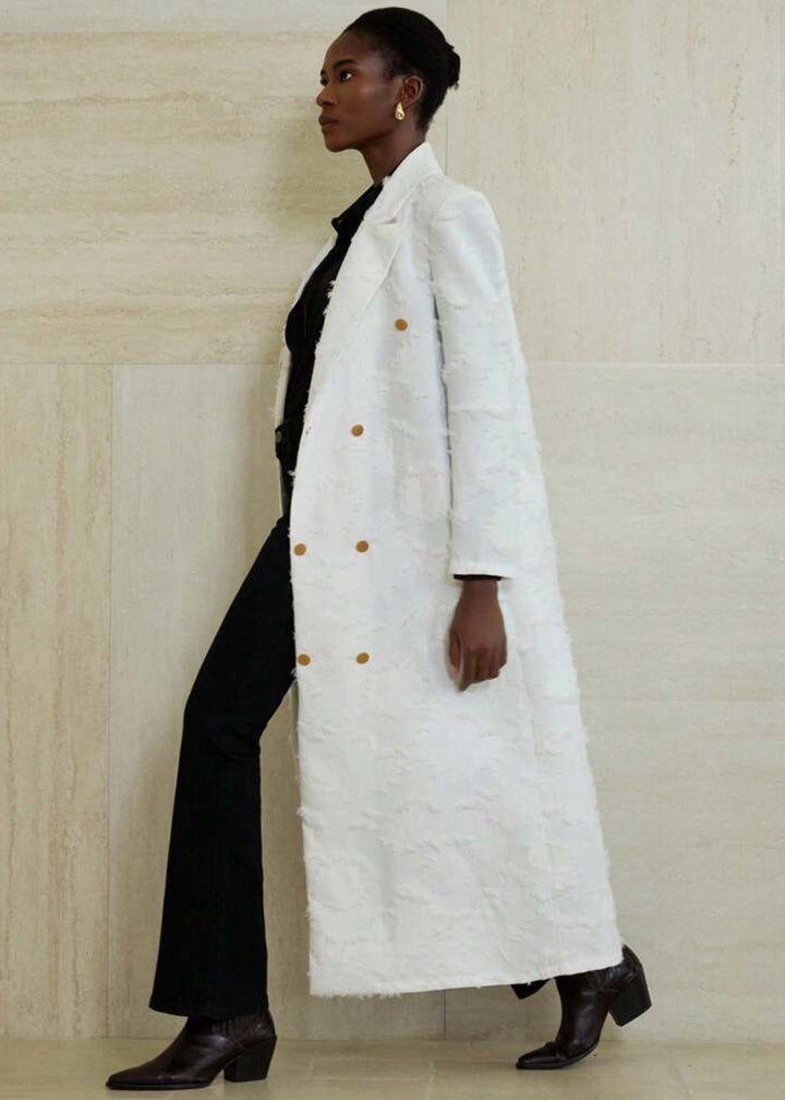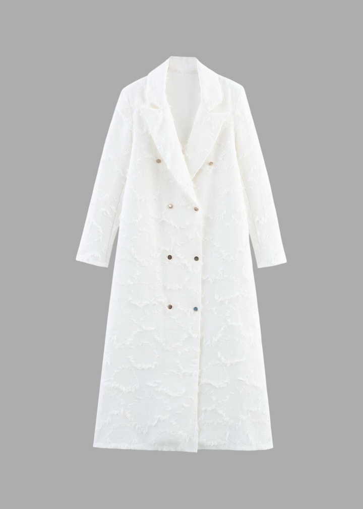 This statement coat features a classic notch lapel collar and a double-breasted button front closure, giving it a structured and timeless silhouette. The coat's standout feature is its all-over frayed texture, which adds a unique, tactile dimension to the design. The longline length provides a dramatic and elegant drape, making this a perfect outerwear piece for elevated occasions or a stylish everyday look.