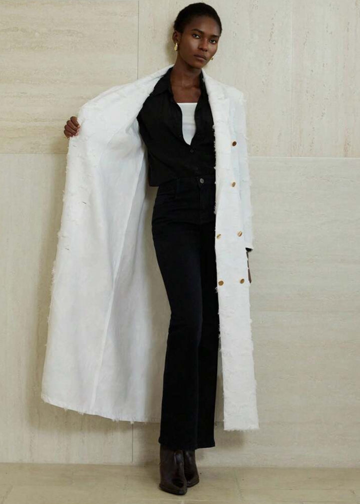 Wear this coat over a monochromatic outfit to let its texture and silhouette be the focal point. It pairs well with tailored trousers, a slip dress, or a simple turtleneck. For a sophisticated look, button it up and wear it with a pair of heeled boots.