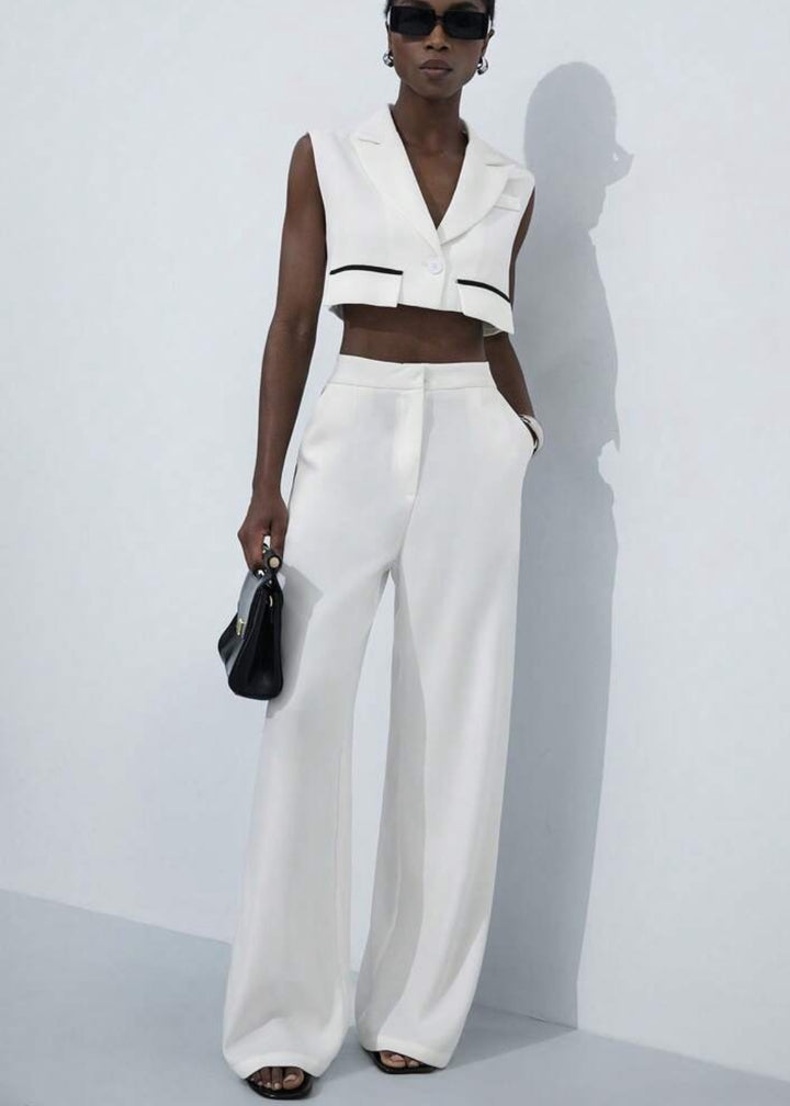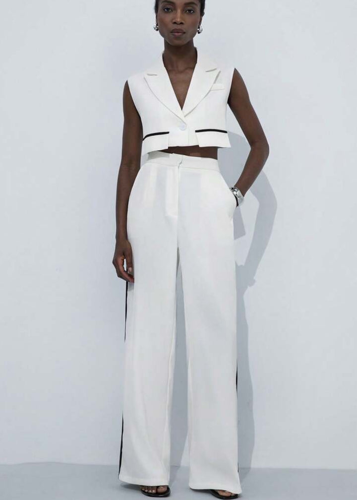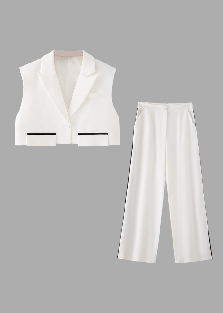 This pant suit is a modern and minimalist take on tailored dressing. It features a sleek sleeveless blazer with a sharp notch lapel and a single-button front closure. The blazer is paired with wide-leg trousers that have a relaxed yet sophisticated silhouette. This coordinated two-piece set offers a streamlined look that is perfect for a variety of occasions, from professional settings to elegant events.