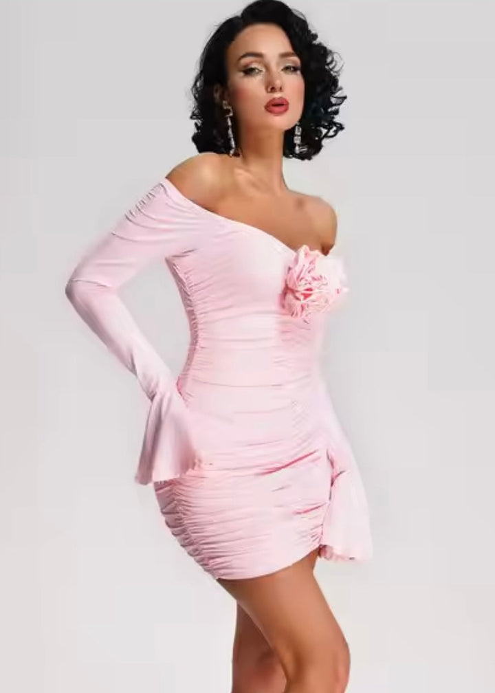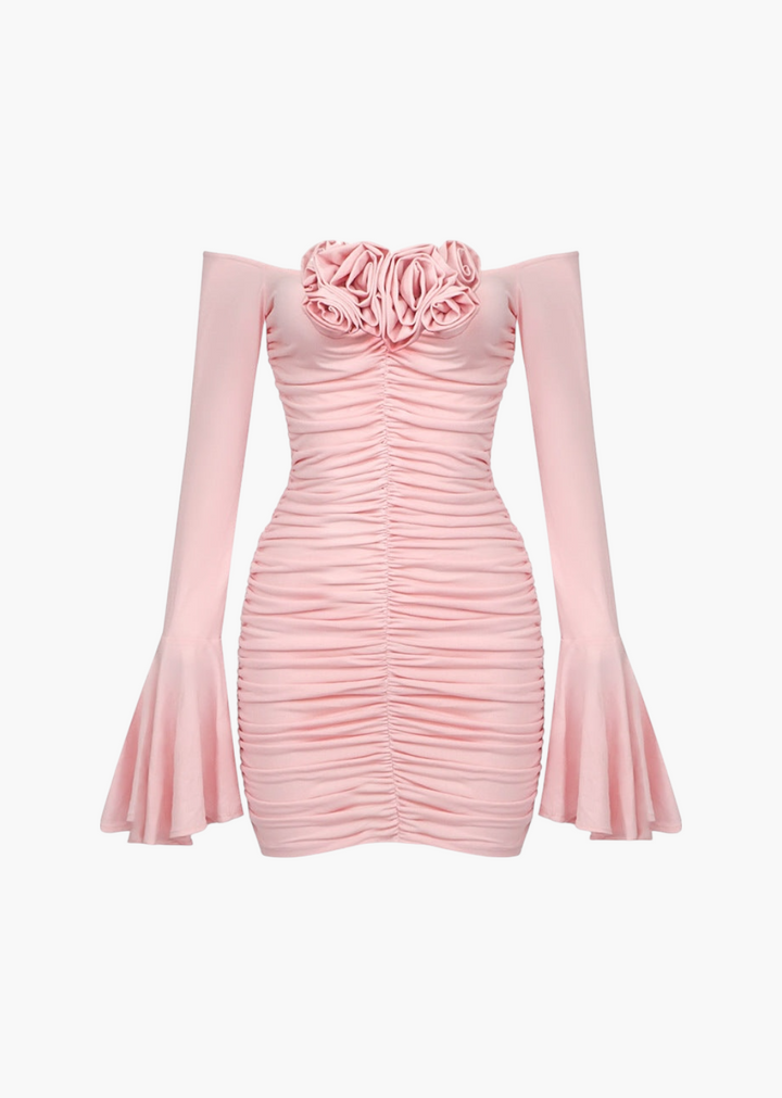 This mini dress features a form-fitting silhouette with all-over ruching, which accentuates the body's curves. It has a flattering off-shoulder neckline and long sleeves that flare slightly at the wrists. The bodice is adorned with a decorative floral appliqué at the center, adding a touch of romance to the design.