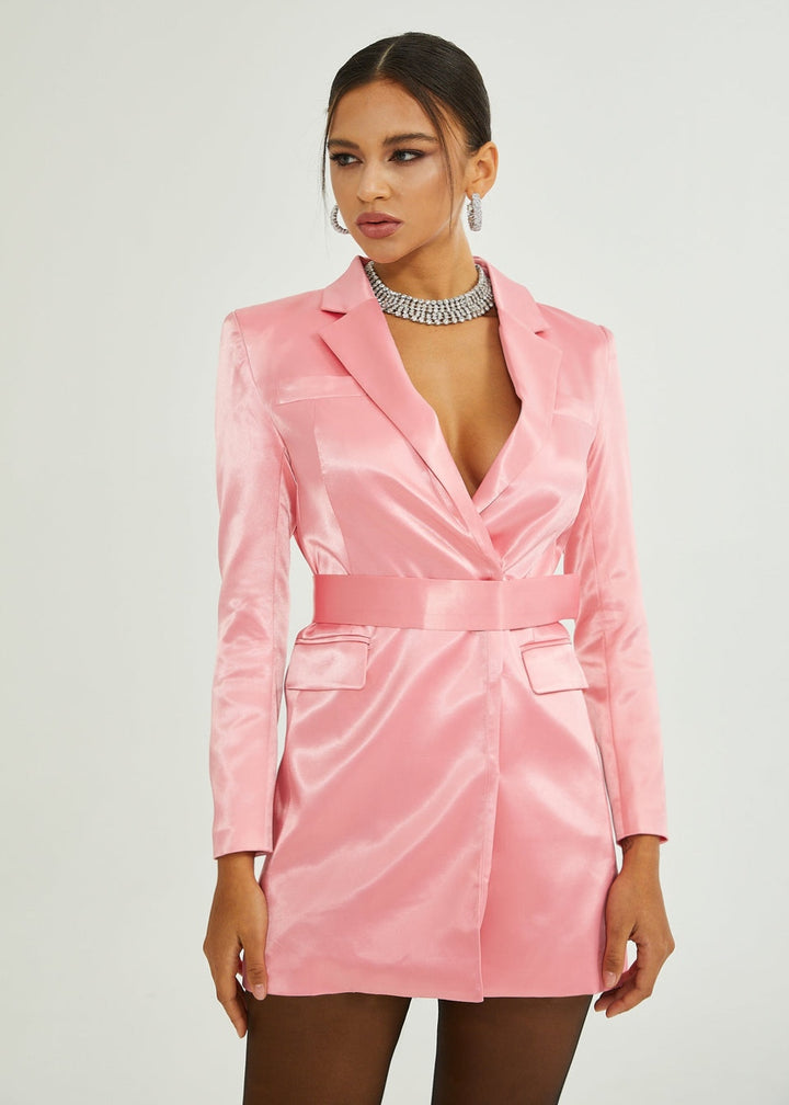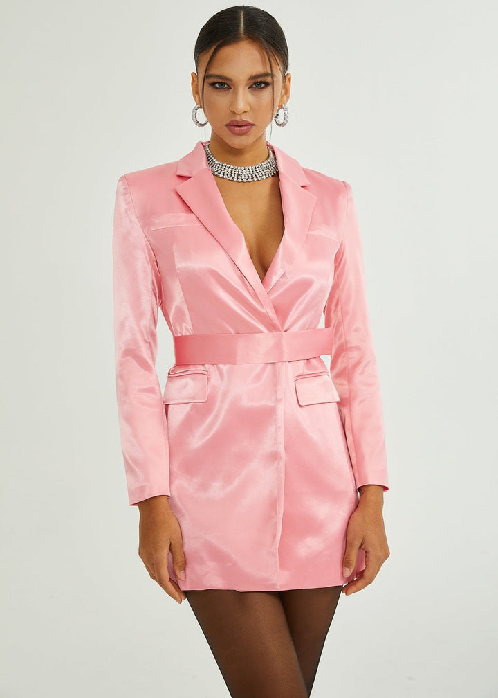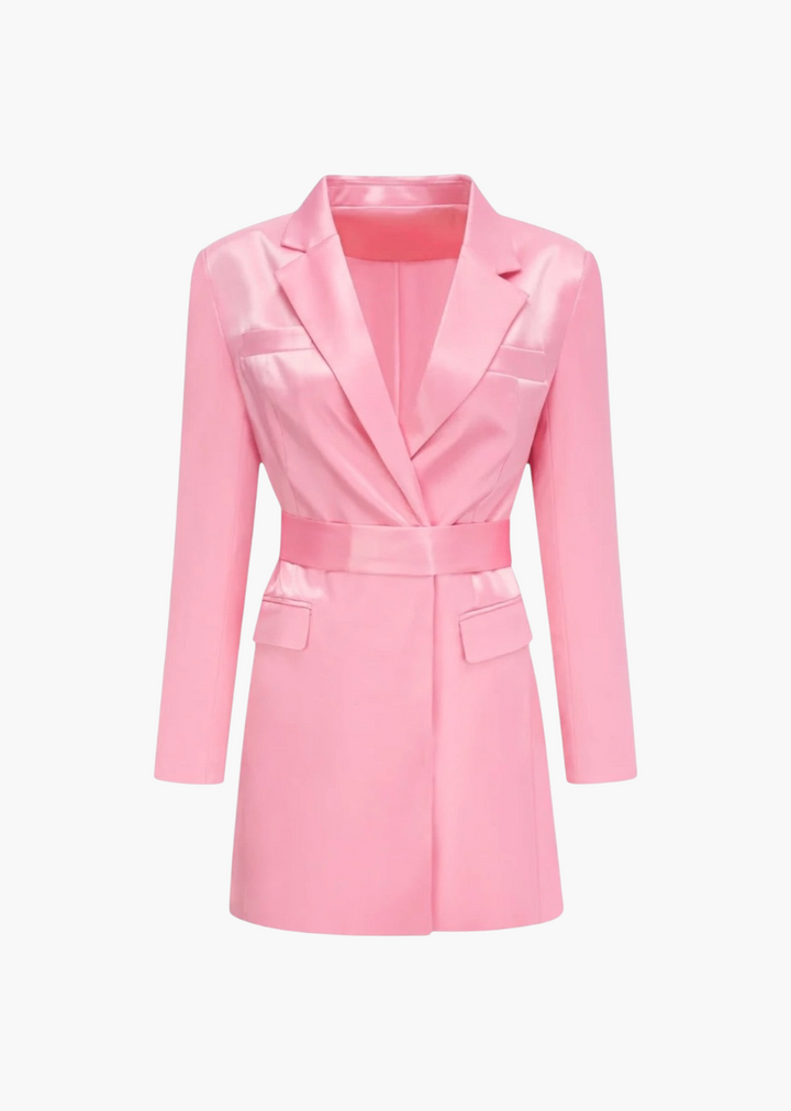 This mini-length blazer dress features a classic peaked lapel collar and a V-neckline. It has long sleeves with shoulder pads, providing a structured silhouette, and a self-tie belt to cinch the waist. The dress is made from a lustrous, satin-like fabric and includes two front flap pockets.