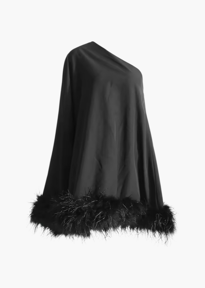 This dress combines dramatic flair with a playful silhouette. It features a one-shoulder design with a flowing cape sleeve that adds a sense of movement and elegance. The dress has a relaxed, shift-style fit and a mini length. A standout detail is the fluffy feather trim that lines the entire hem, providing a luxurious texture and a touch of fun.