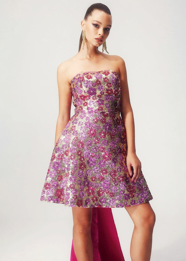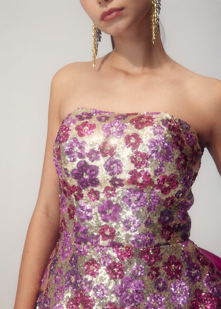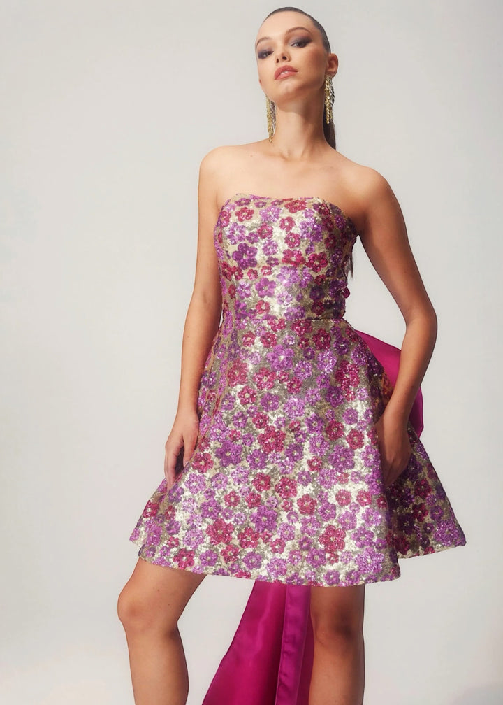 This high-impact mini dress is a captivating blend of playful charm and glamorous sophistication. The strapless bodice and A-line skirt are completely covered in an intricate floral sequin pattern that sparkles with every movement. The dress is designed for a mini length, showcasing the legs. The most striking feature is the dramatic, oversized bow attached to the back, which cascades down into a sweeping train. The back of the bodice features a lace-up detail, allowing for a custom and secure fit. This unique combination of a fun mini dress with a formal train makes it a show-stopping choice for any special occasion.