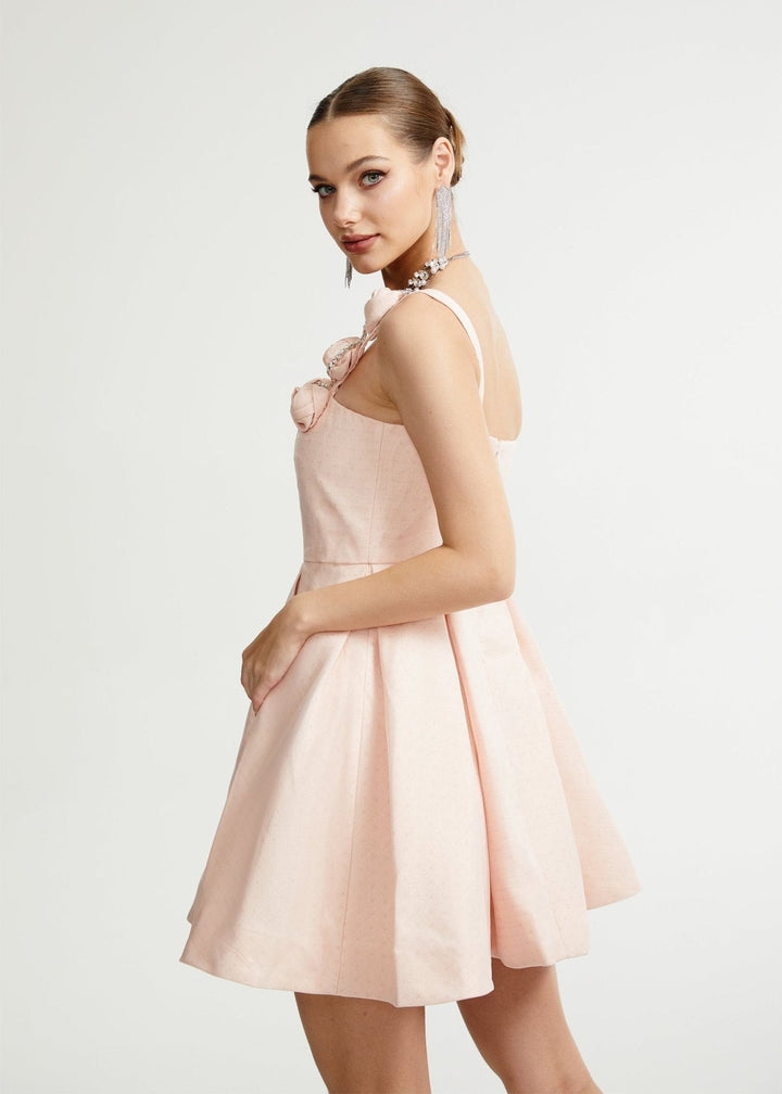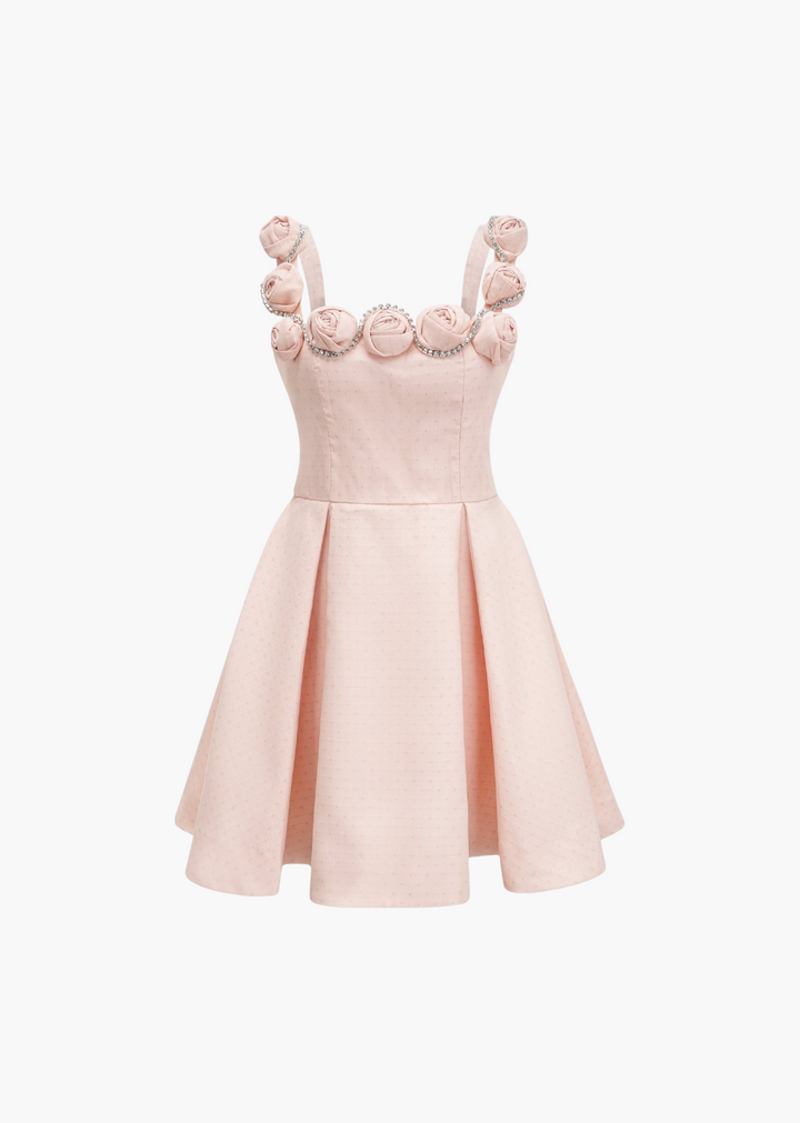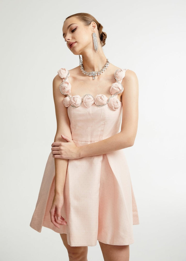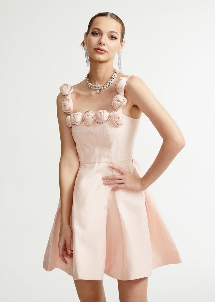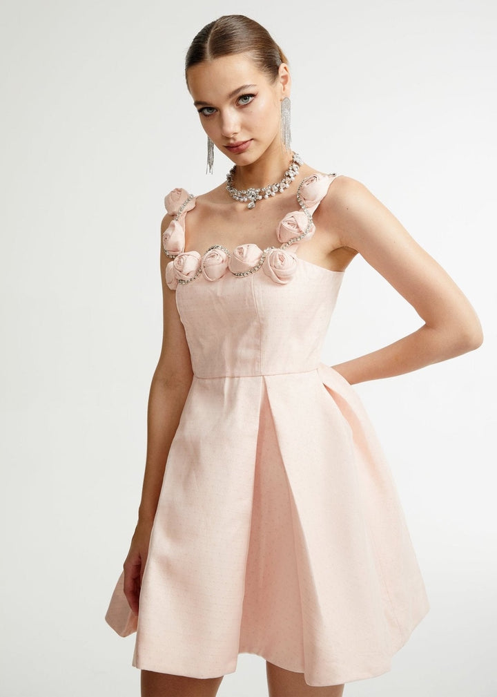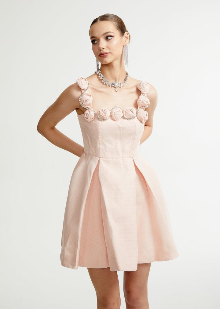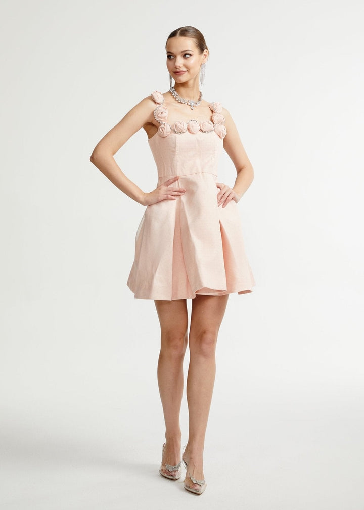 This charming mini dress combines a classic silhouette with delicate, feminine details. It features a square neckline with straps adorned with intricately crafted floral appliqués, adding a romantic touch. The fitted bodice cinches at the waist, leading to a pleated A-line skirt. The fabric has a subtle texture, giving it a sophisticated finish. A concealed zipper at the back ensures a smooth fit. This dress is a graceful choice for garden parties, bridal showers, or daytime events.