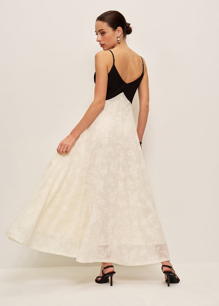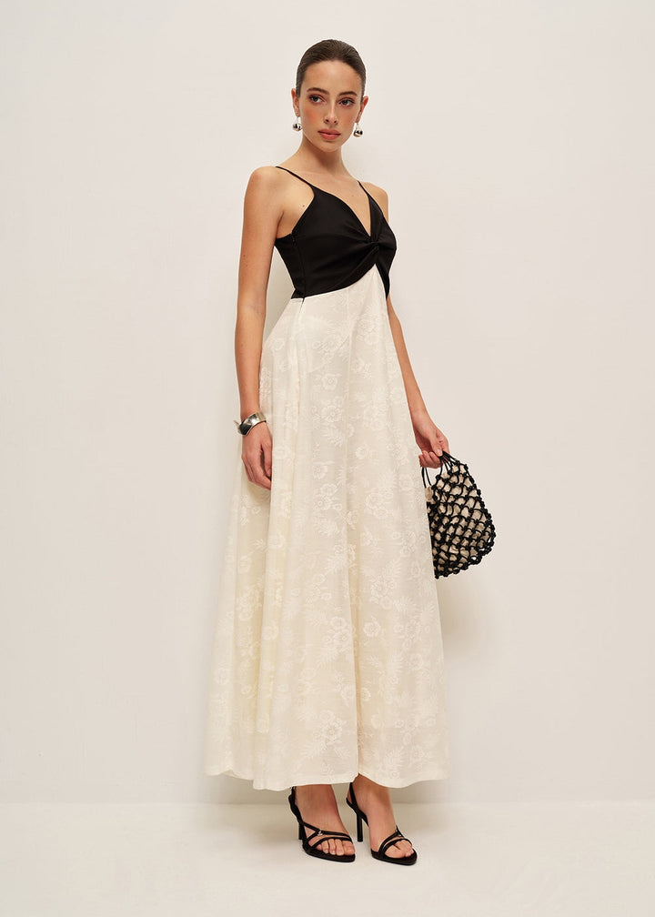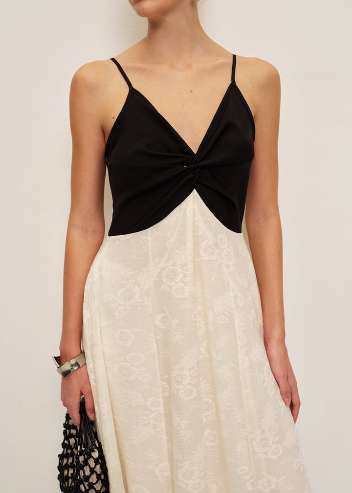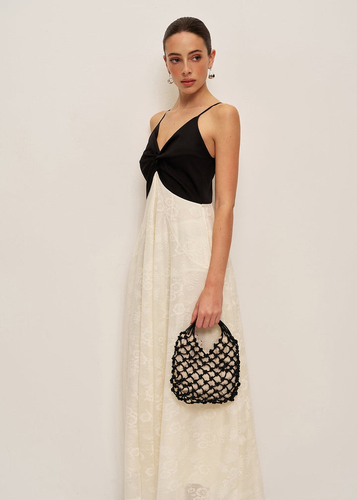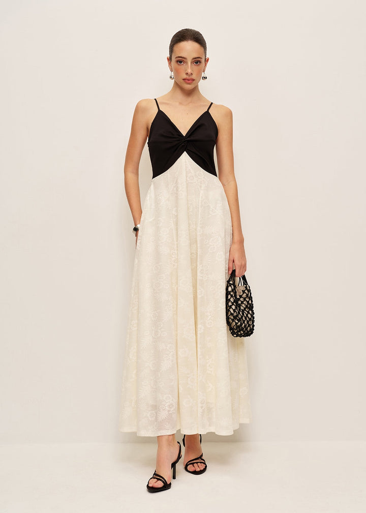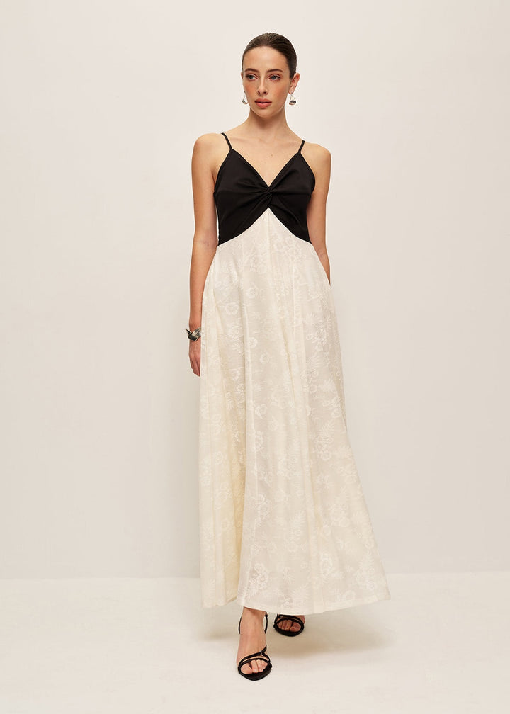 Make a sophisticated statement with this elegant maxi dress. Featuring a flowing maxi-length skirt, this dress is designed to create a graceful silhouette. The bodice showcases a distinctive twisted knot detail at the center front, adding a touch of unique texture and visual interest. Supported by delicate spaghetti straps, the dress offers a refined and understated look. The skirt presents a subtle floral pattern, providing a beautiful contrast to the solid bodice. This dress is a versatile choice for evening events, weddings, or any occasion where an elegant and stylish presence is desired.