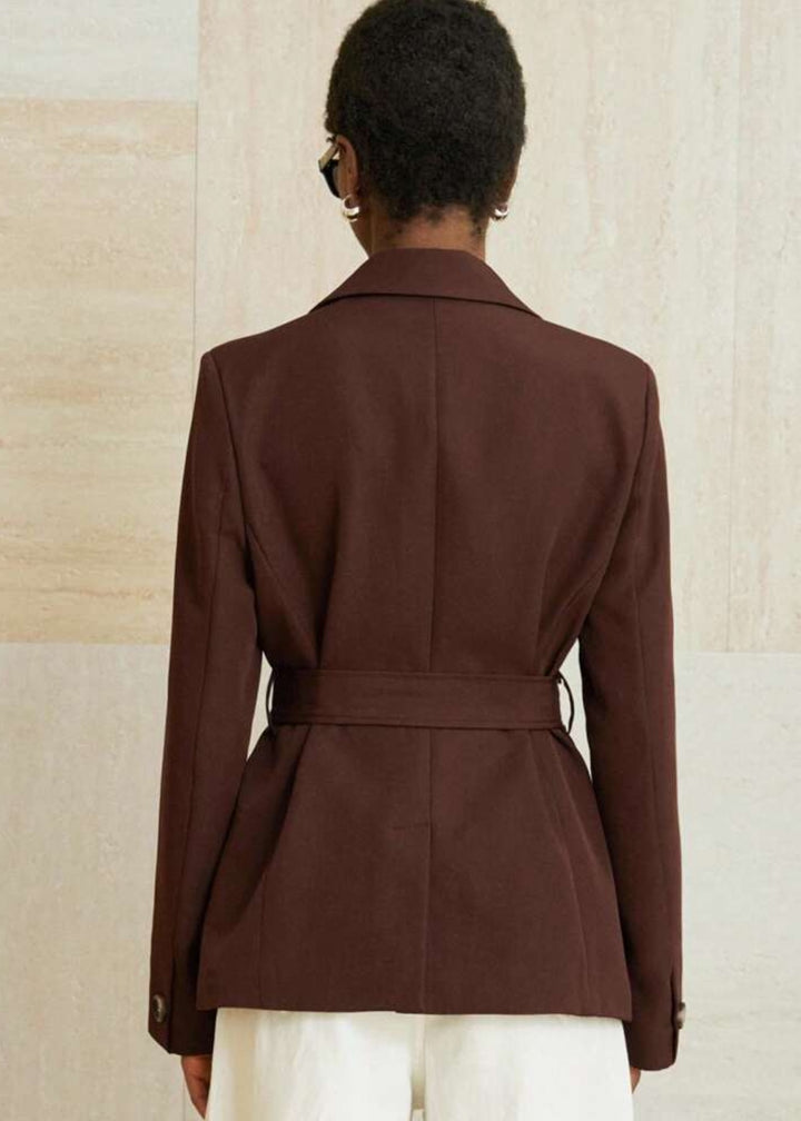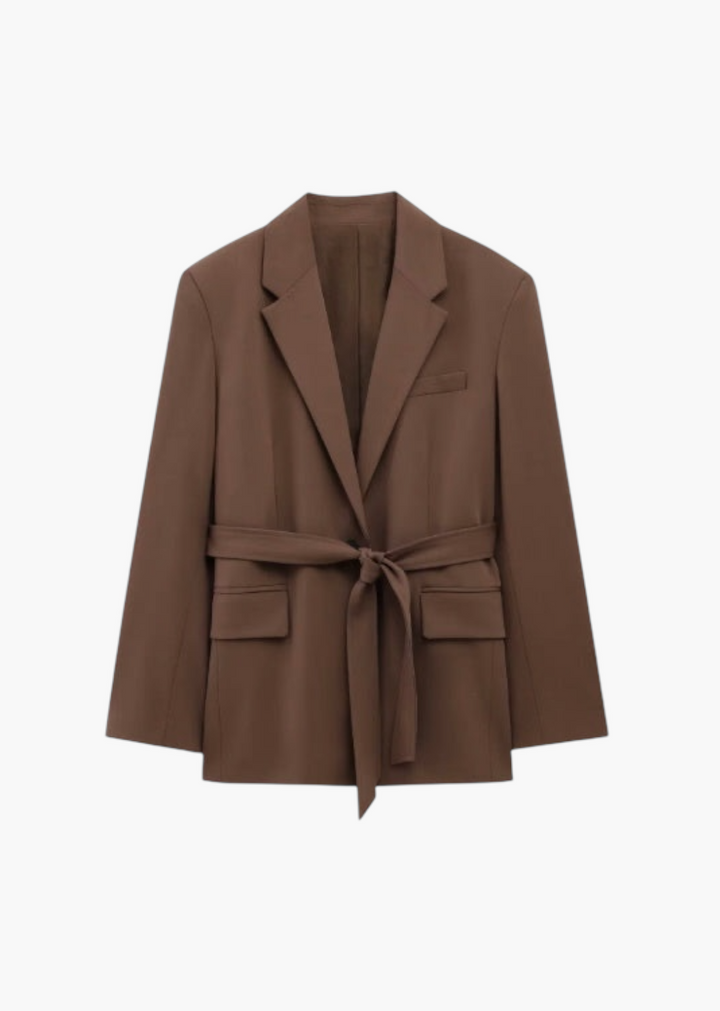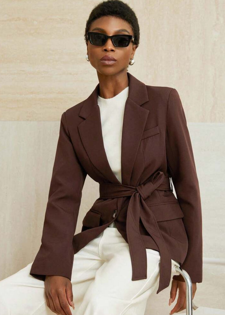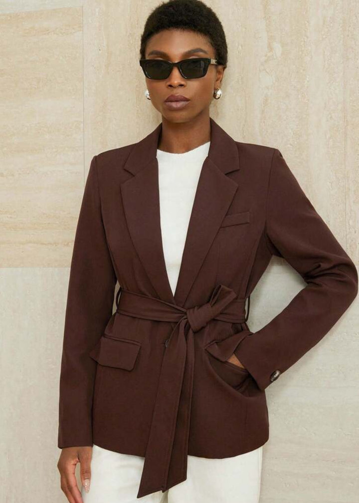 For a sharp office look, wear this blazer over a simple blouse with tailored trousers or a pencil skirt. To create a chic casual outfit, layer it over a basic tee and pair with jeans and sneakers or ankle boots. The tie belt can be worn in a bow or a simple knot to change the look.