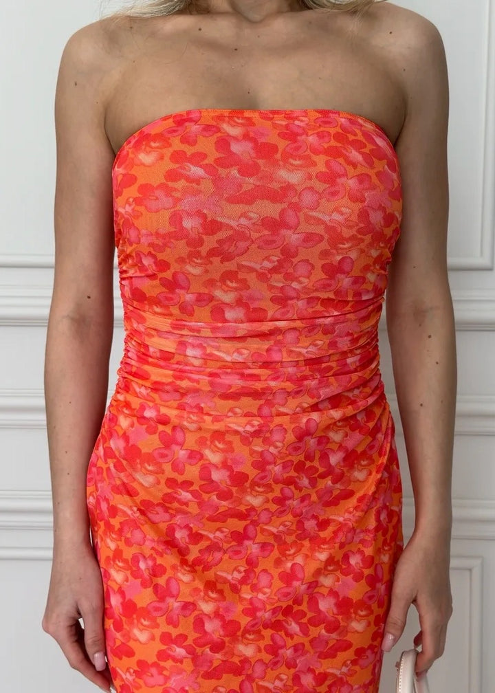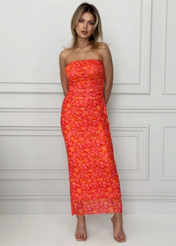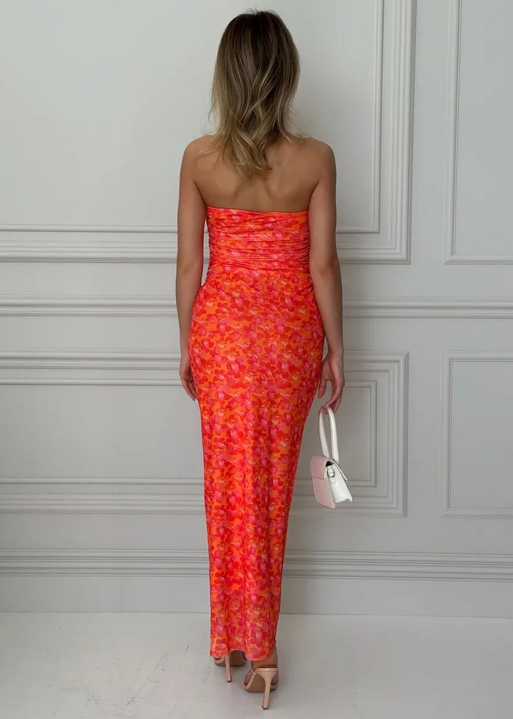 Elevate your style with our Floral Print Strapless Ruched Maxi Dress featuring a flattering fitted silhouette. This stunning piece showcases a beautiful ruched design that hugs your curves in all the right places. The strapless neckline adds a touch of elegance, making it perfect for evening events, summer weddings, or a night out with friends.