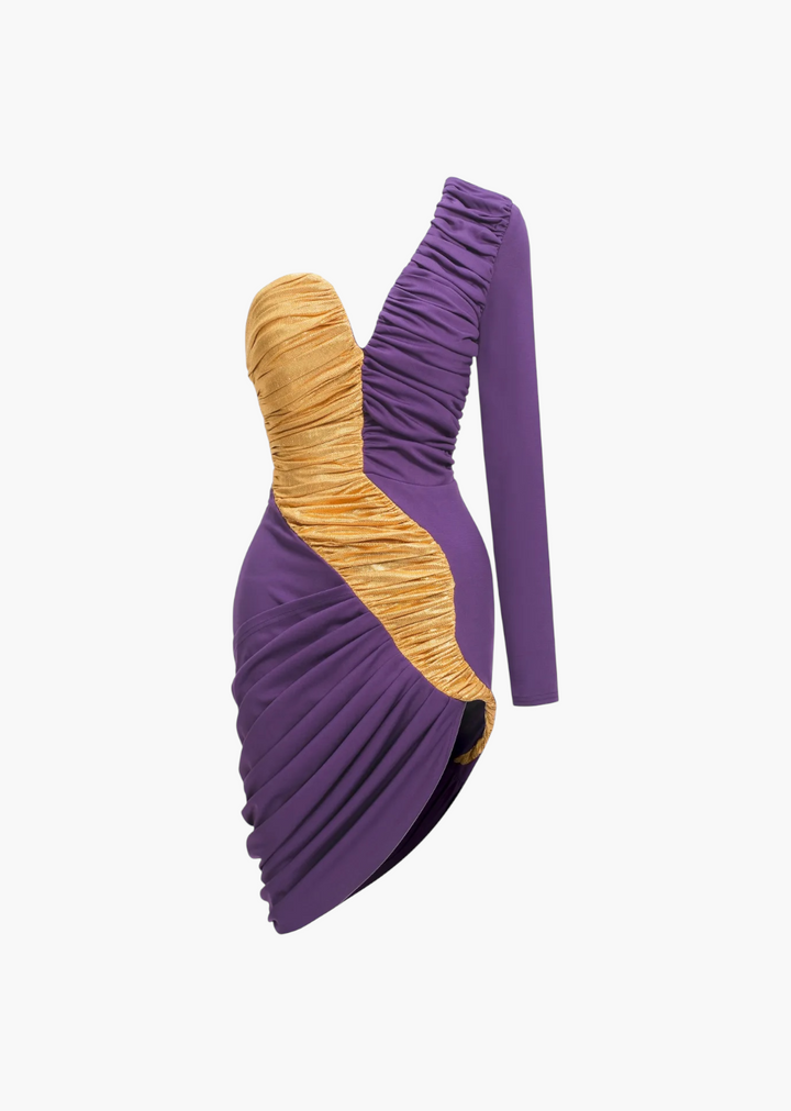A statement piece that blends asymmetry and sculptural contrast, this one-sleeve mini dress is designed for bold elegance. Crafted with strategic ruching throughout, it contours the body while offering a high-slit silhouette that exudes confidence. The metallic waistband detail draws the eye and defines the waist, creating a striking contrast against the rich fabric. Perfect for cocktail events or upscale evening outings, pair it with minimal gold accessories and strappy stilettos to amplify its runway-ready edge.
